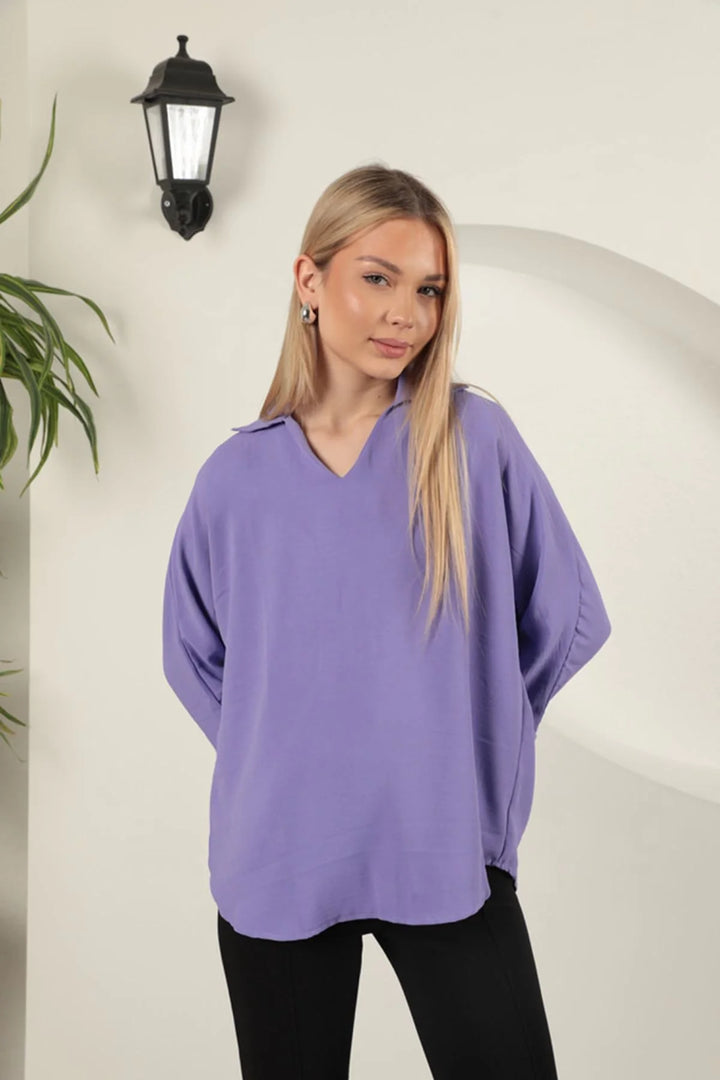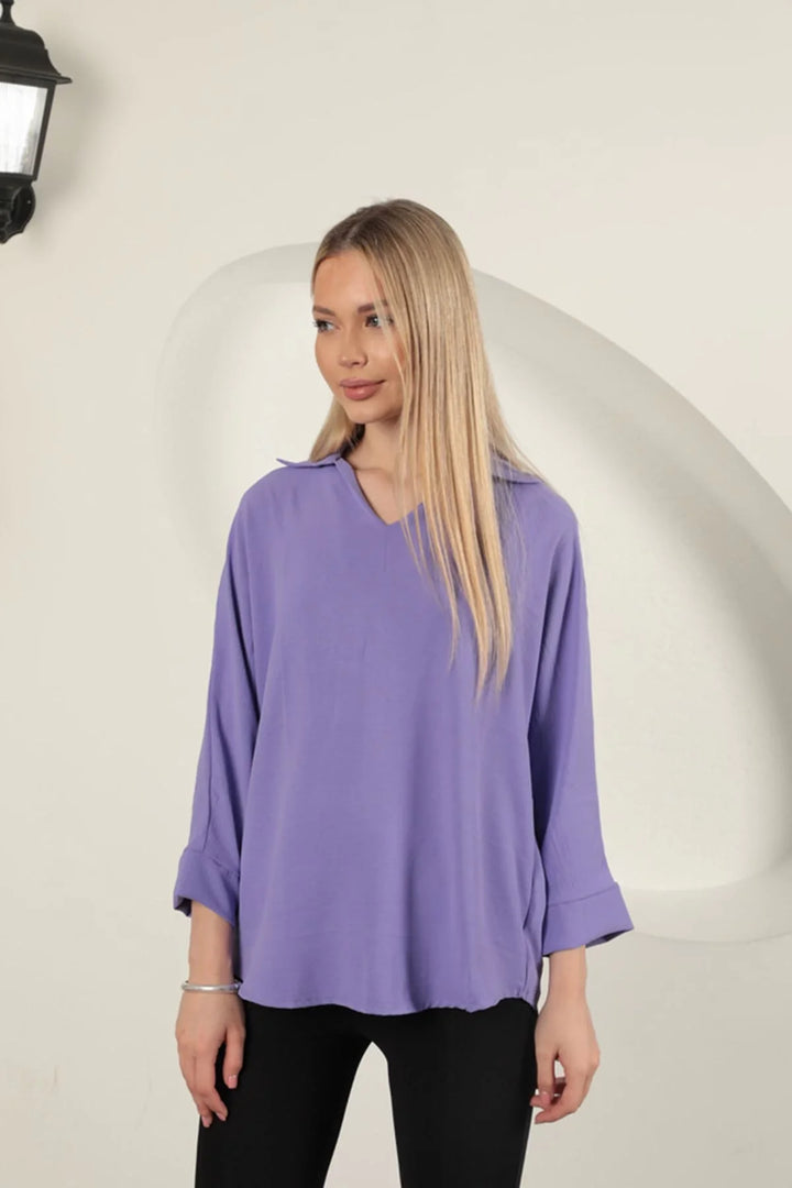 Aerobin Kumaş V Gömlek Yaka Kadın Gömlek-Lila