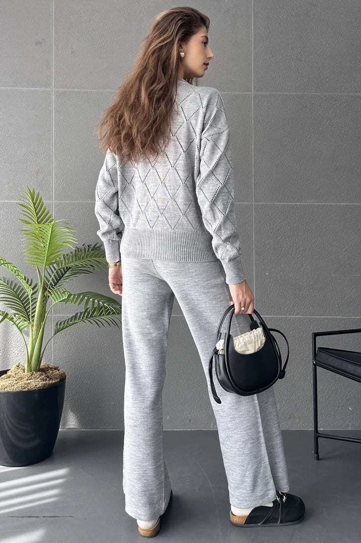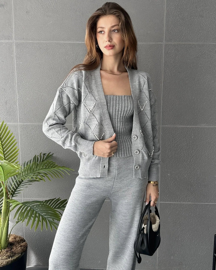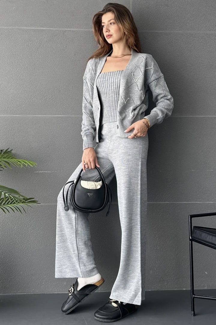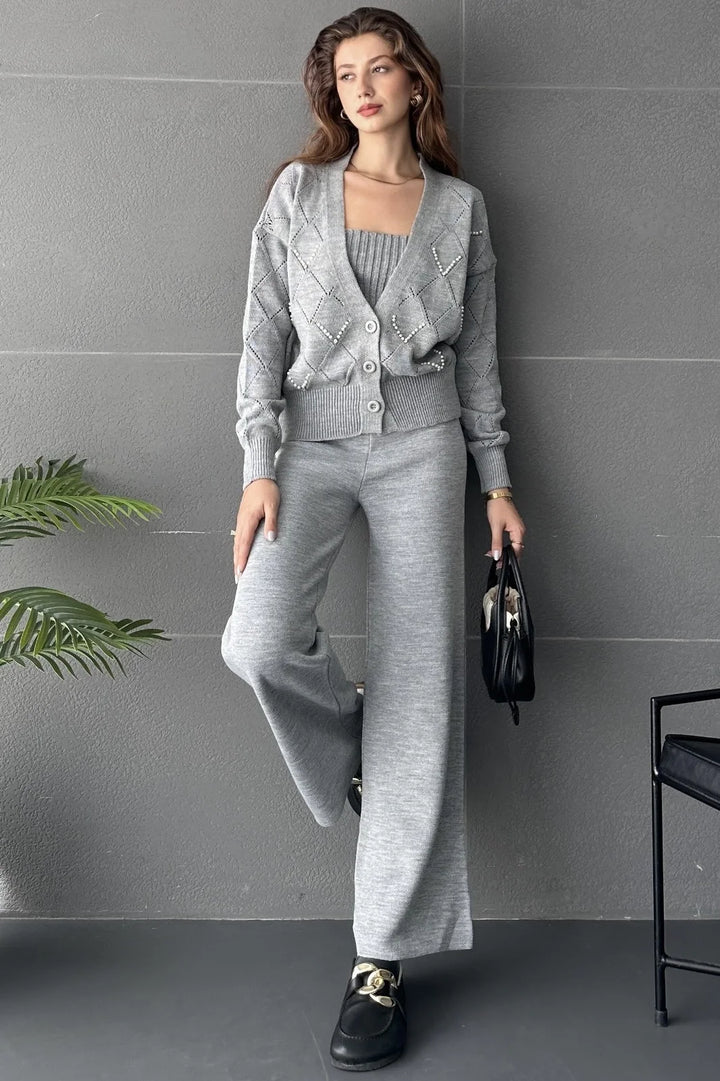 Baklava Desenli Boncuk İşlemeli 3'Lü Triko Takım