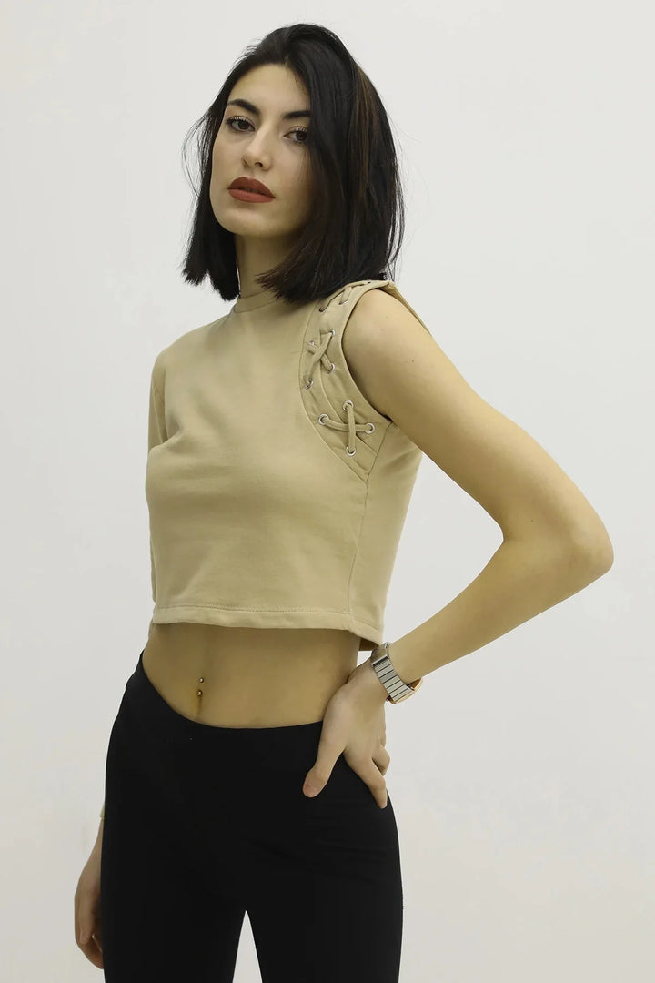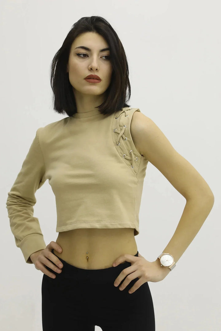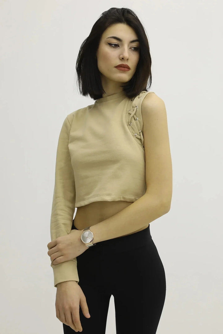 Bisiklet Yaka Tek Kol Bluz Vizon - P-019678