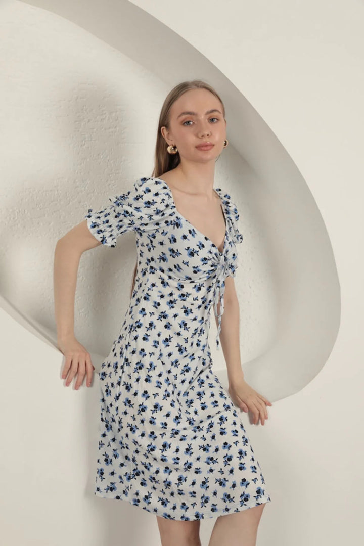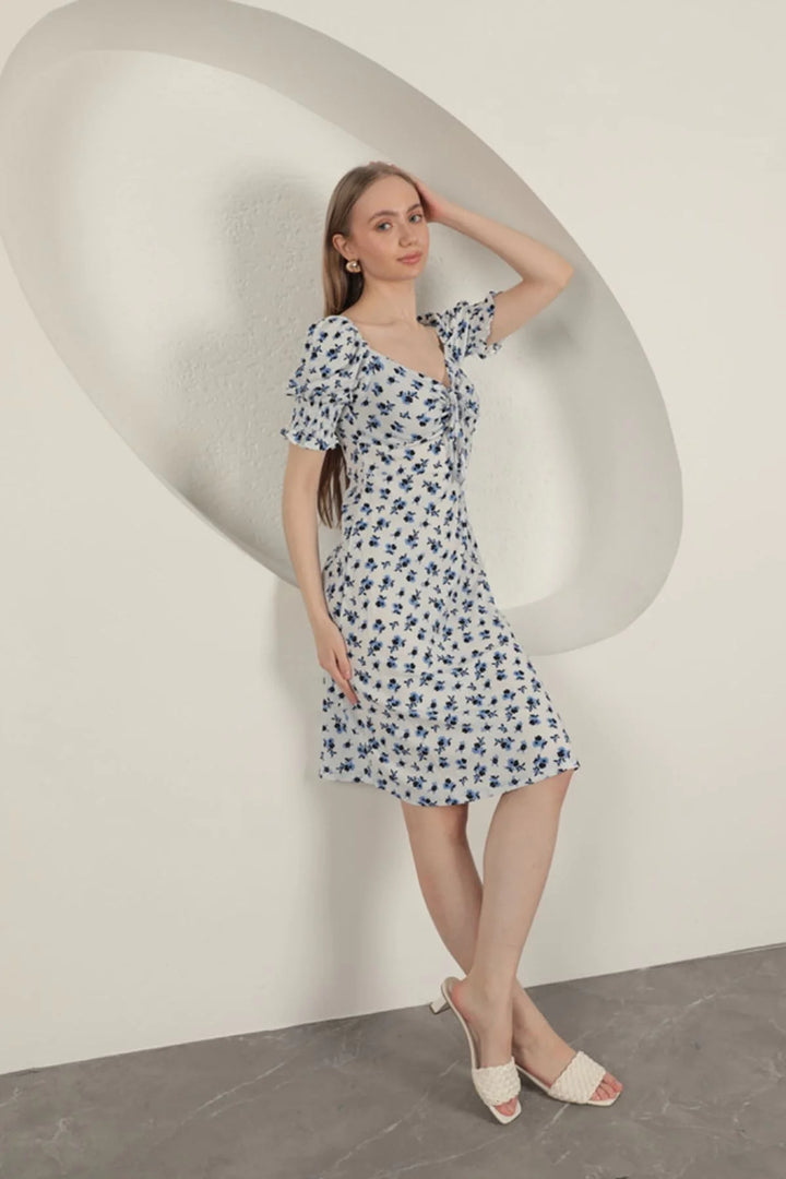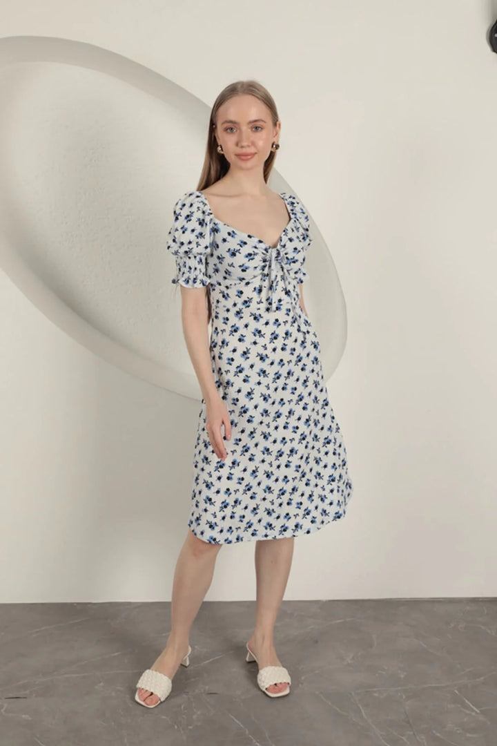 Bürümcük Çıtır Çiçek Desen Elbise-Saks