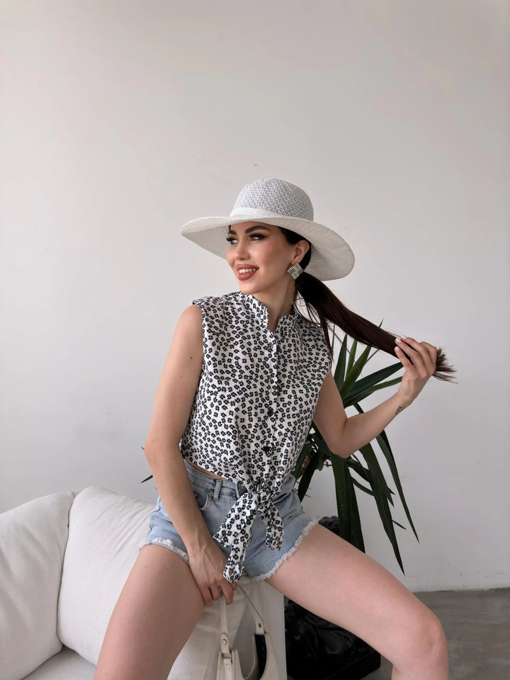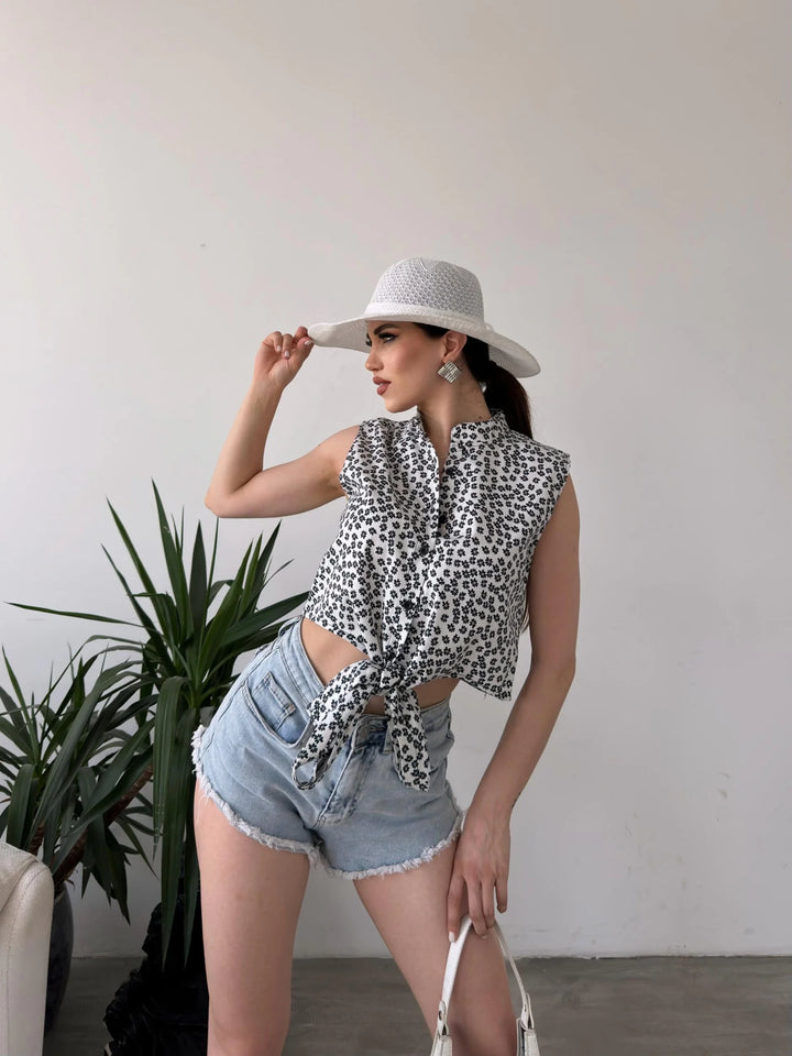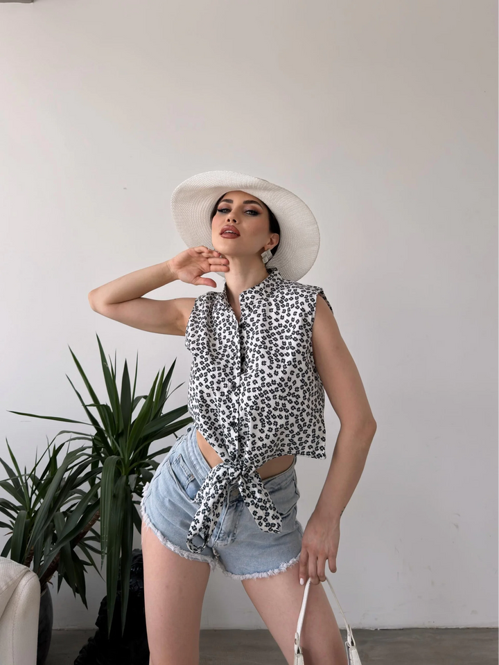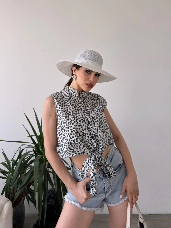 Çiçek Desenli Bağlama Detaylı Crop Gömlek Bluz