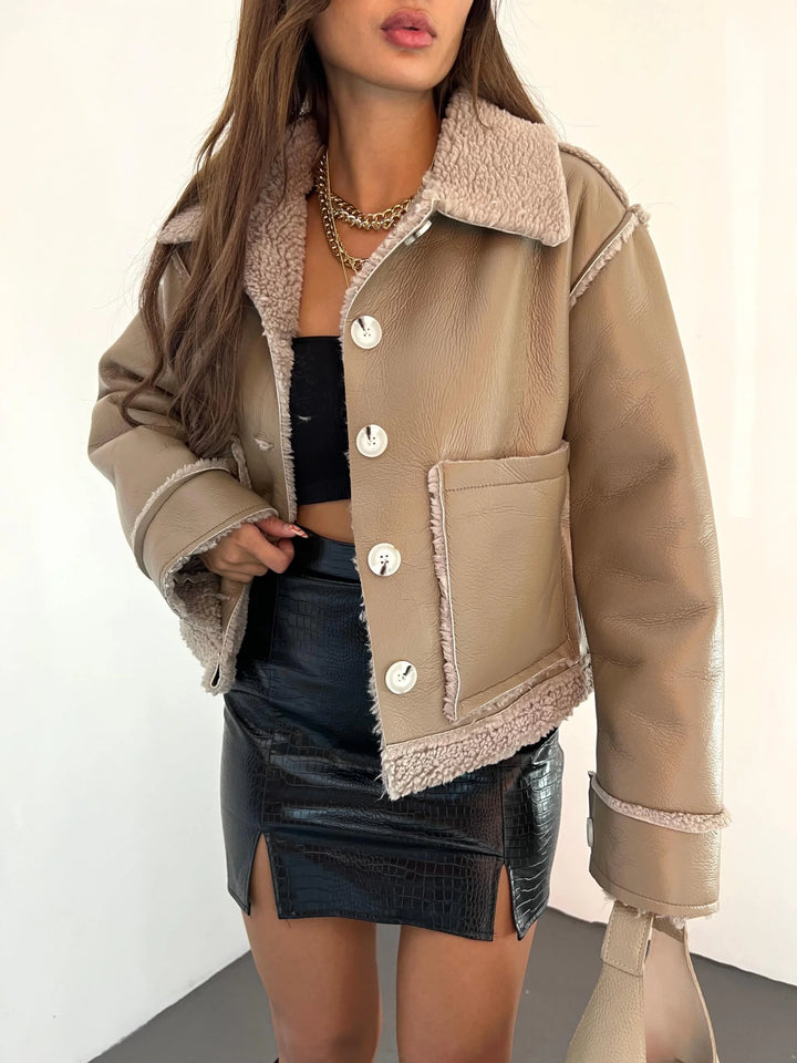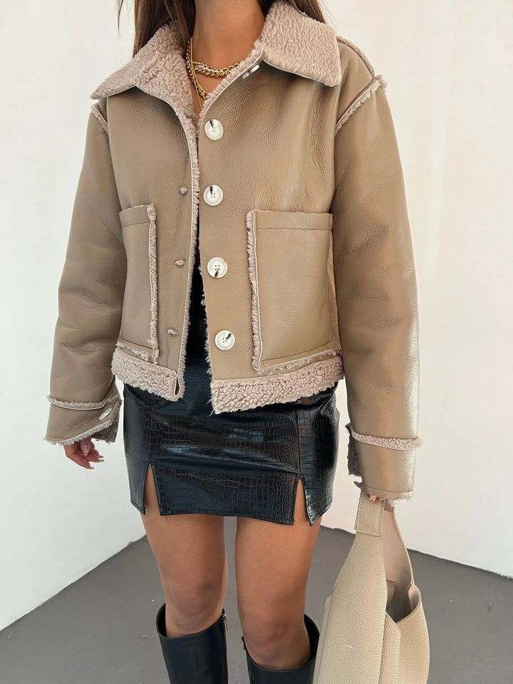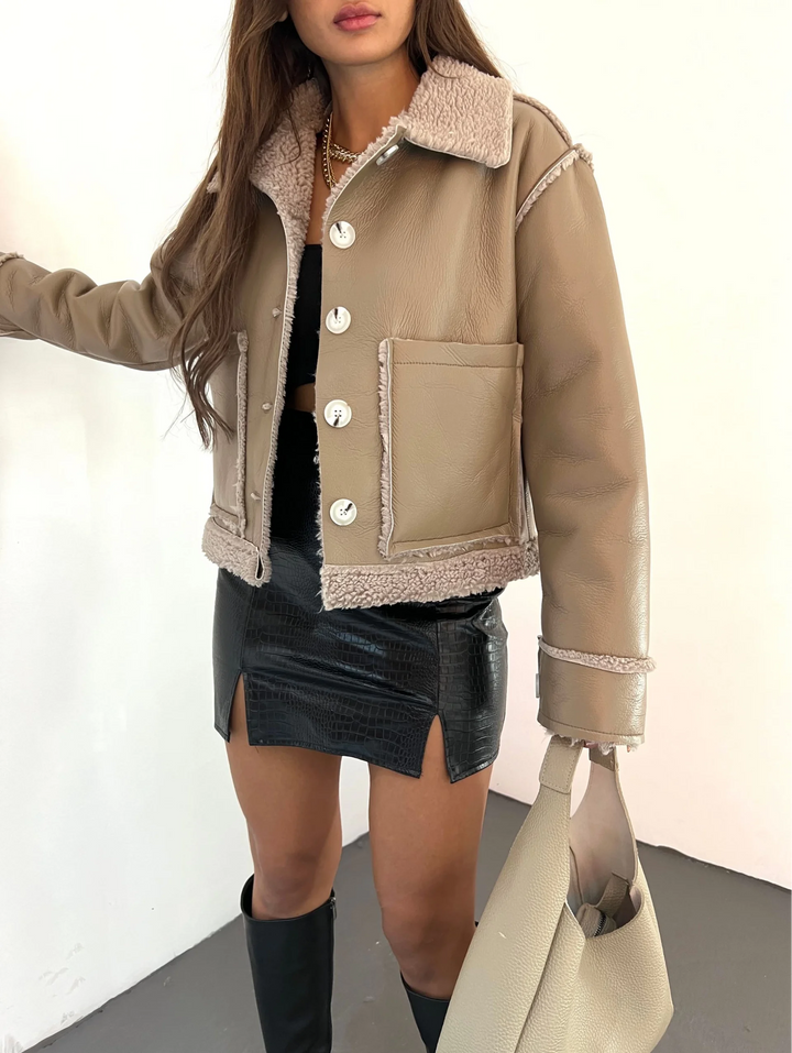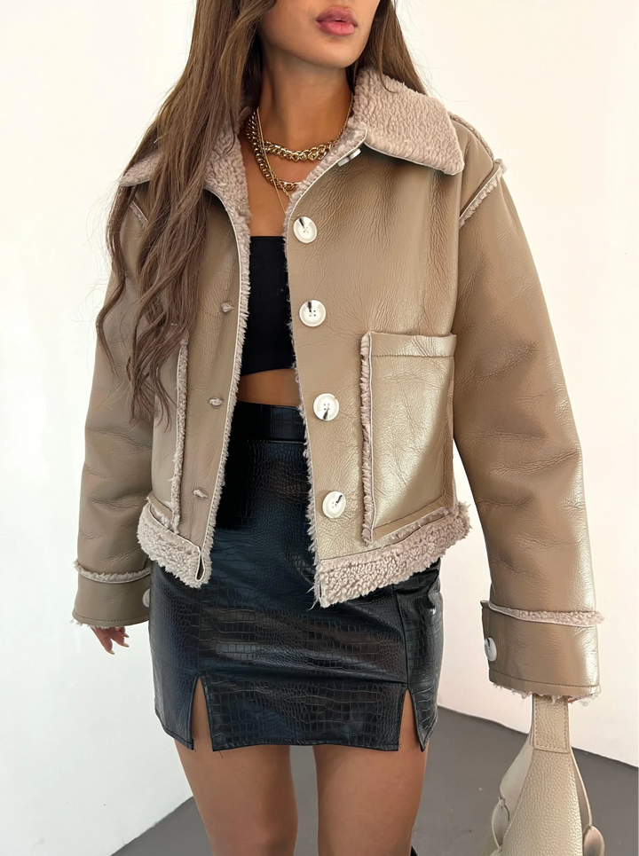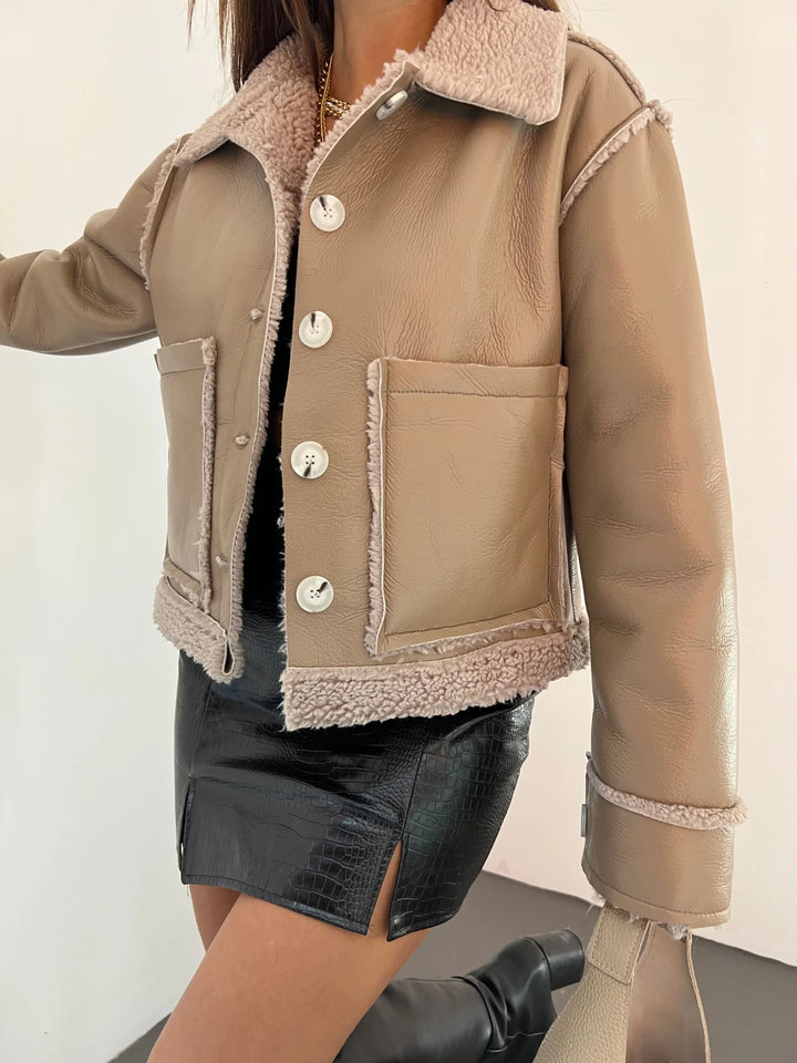 Çift Cepli Kürk Detaylı Suni Deri Ceket