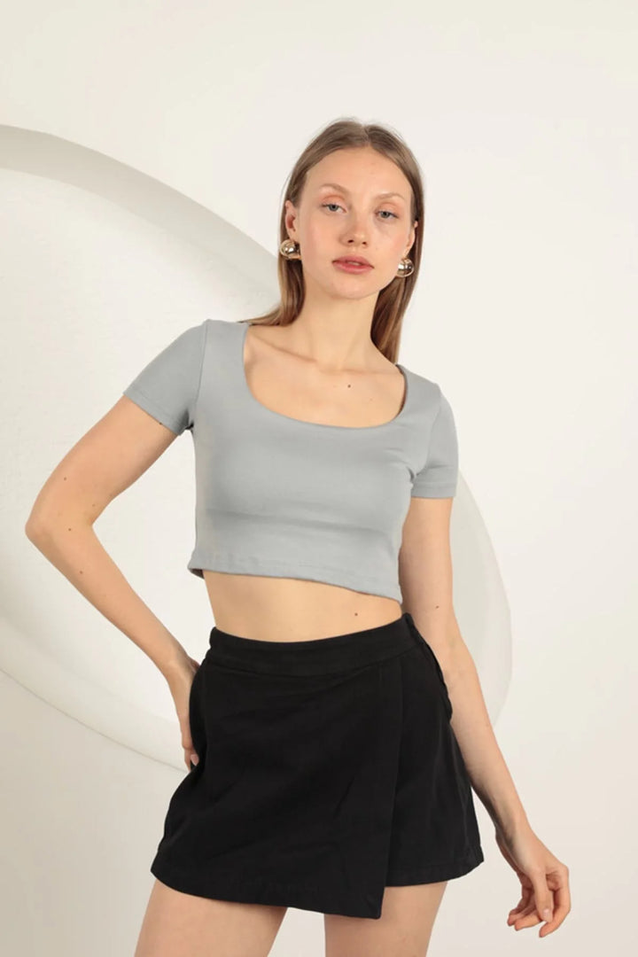 Çilek Viskon Kumaş U Yaka Bluz-Gri