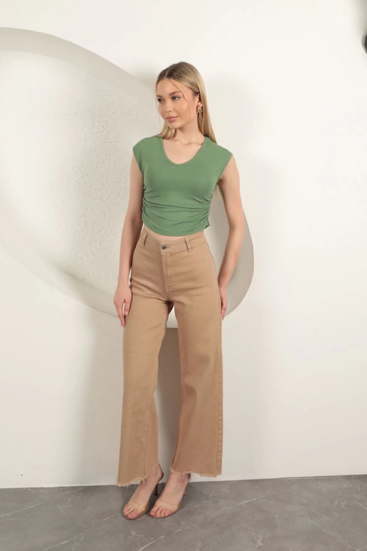 Çilek Viskon Kumaş Yanları Büzgülü Bluz-Haki
