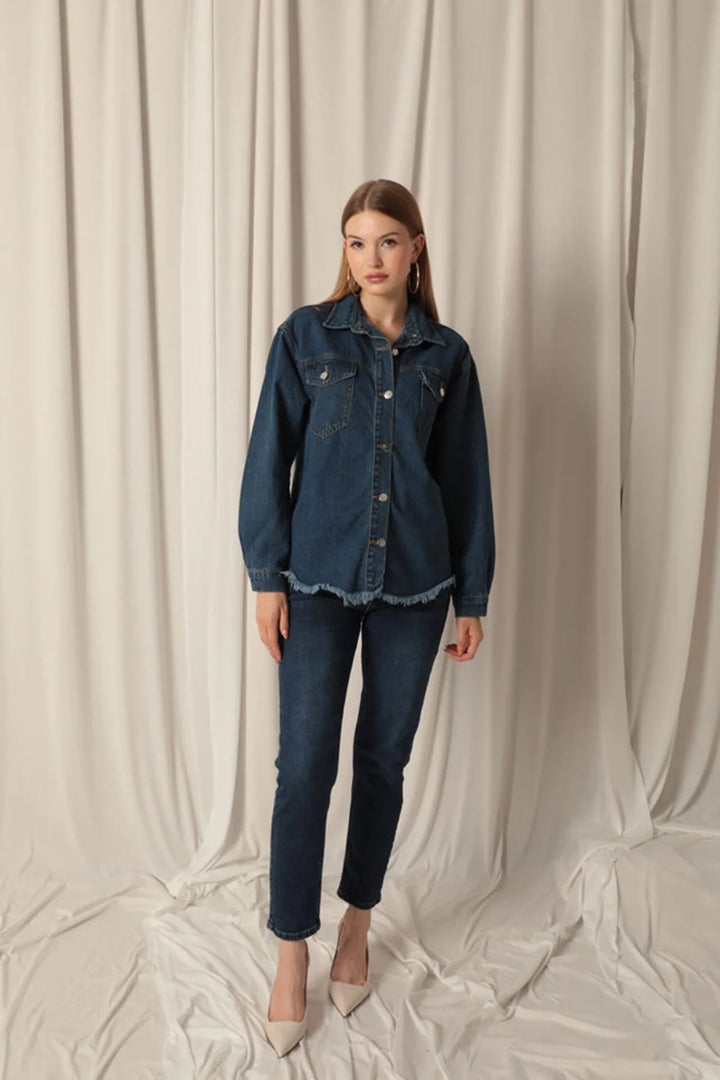 Denim Kumaş Cep Detay Püsküllü Kadın Mavi Kot Ceket