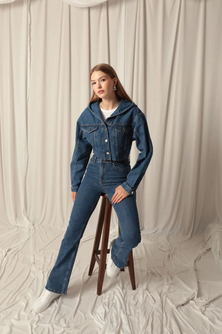 Denim Kumaş Kapüşonlu Kısa Kadın Lacivert Kot Ceket