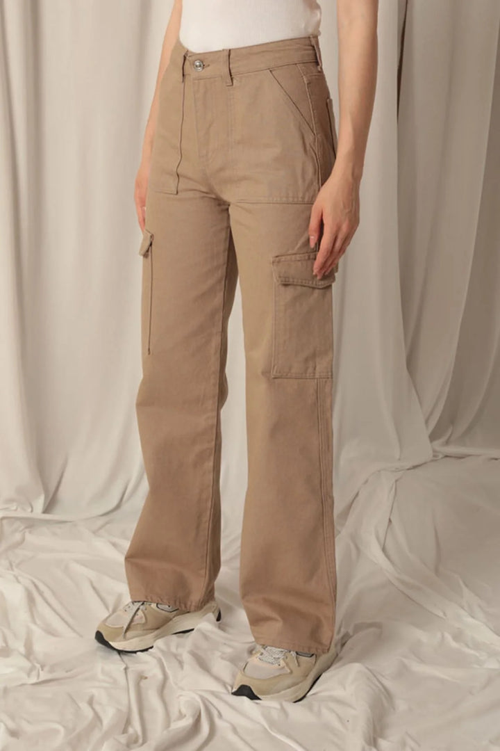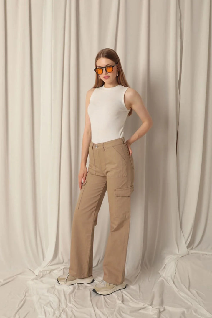 Denim Kumaş Kargo Cepli Kadın Bej Pantolon
