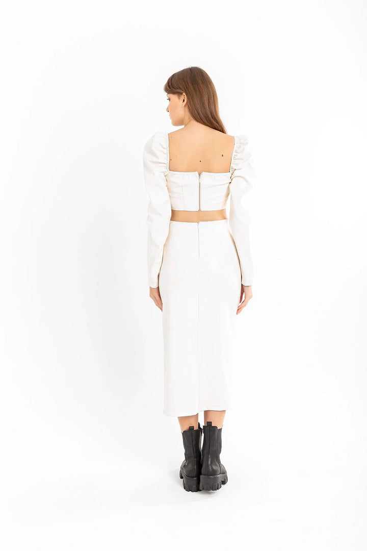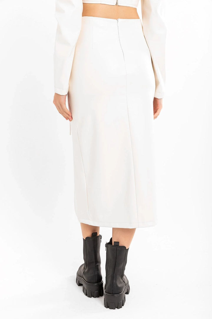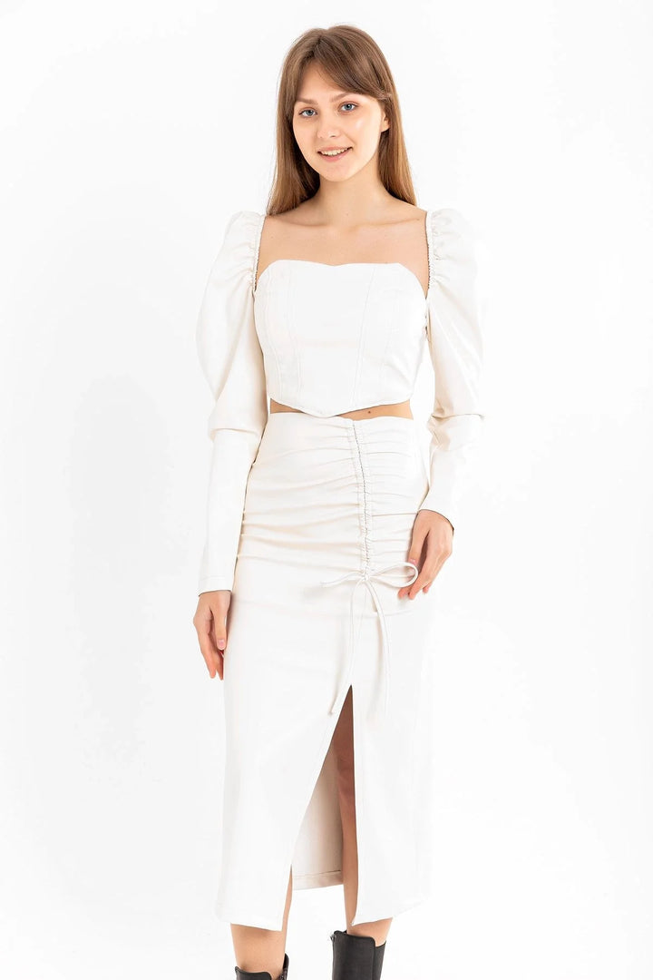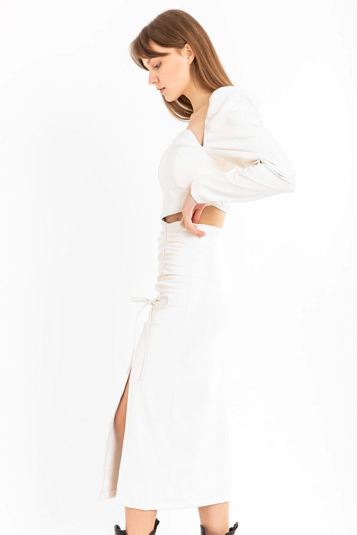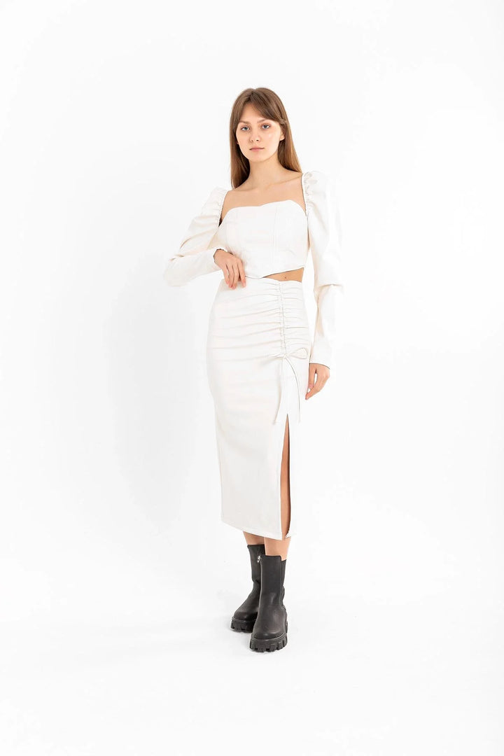 Deri Kumaş Diz Altı Boy Yırtmaçlı Büzgü Detaylı Kadın Etek-Ekru