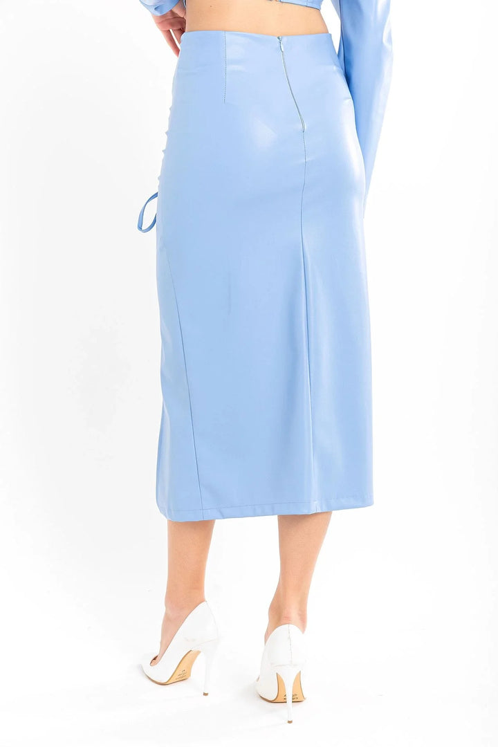 Deri Kumaş Diz Altı Boy Yırtmaçlı Büzgü Detaylı Kadın Etek-Mavi