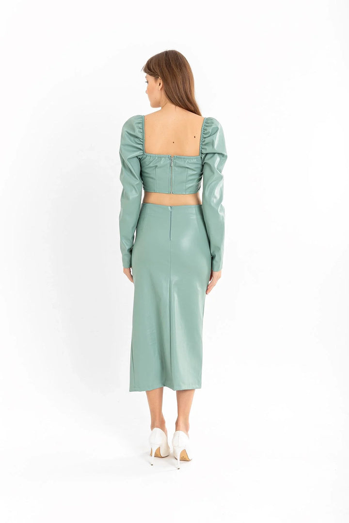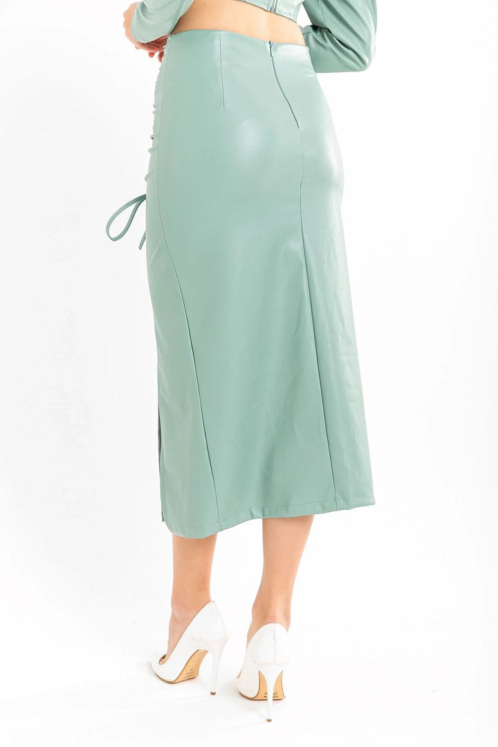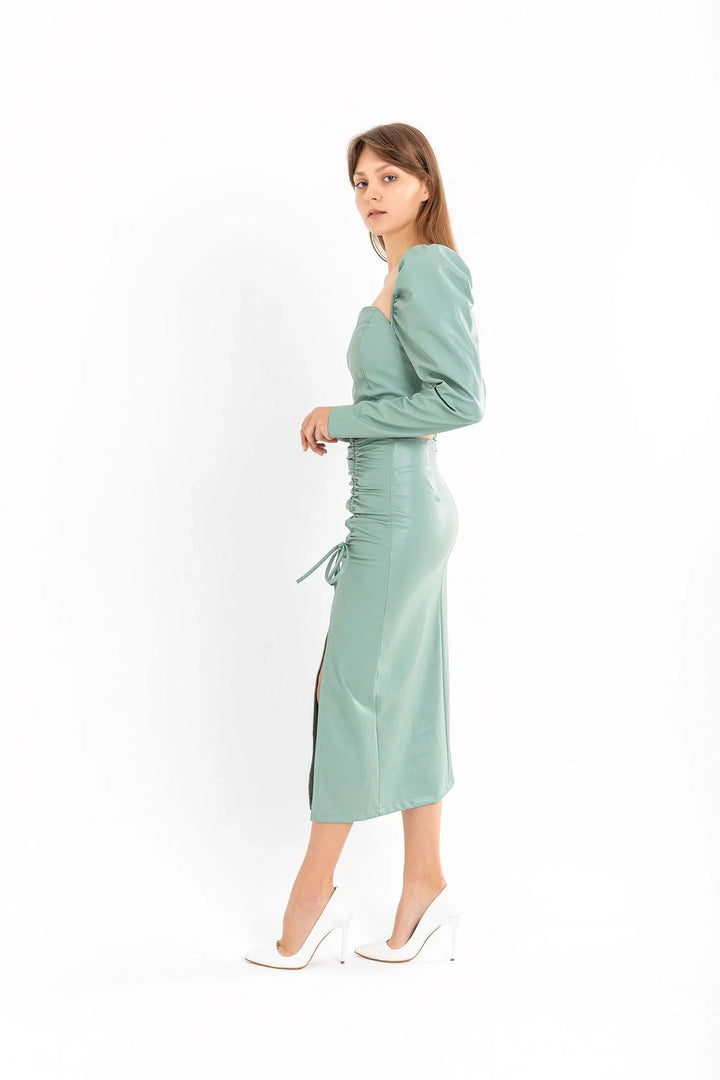 Deri Kumaş Diz Altı Boy Yırtmaçlı Büzgü Detaylı Kadın Etek-Mint