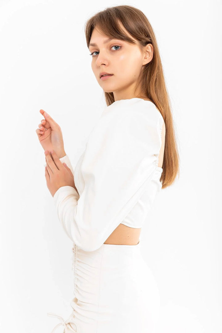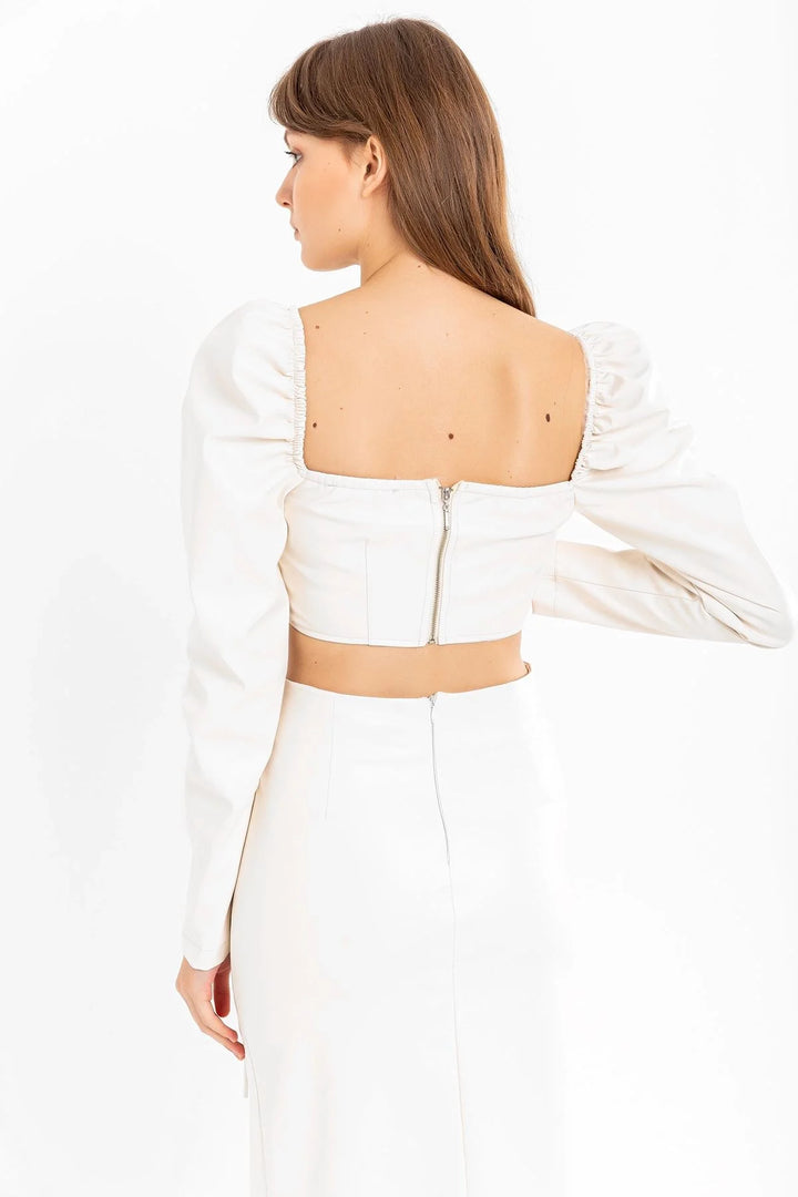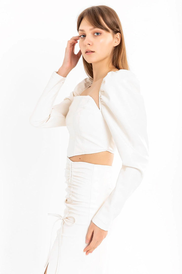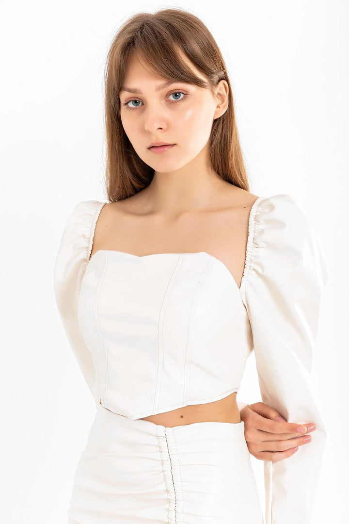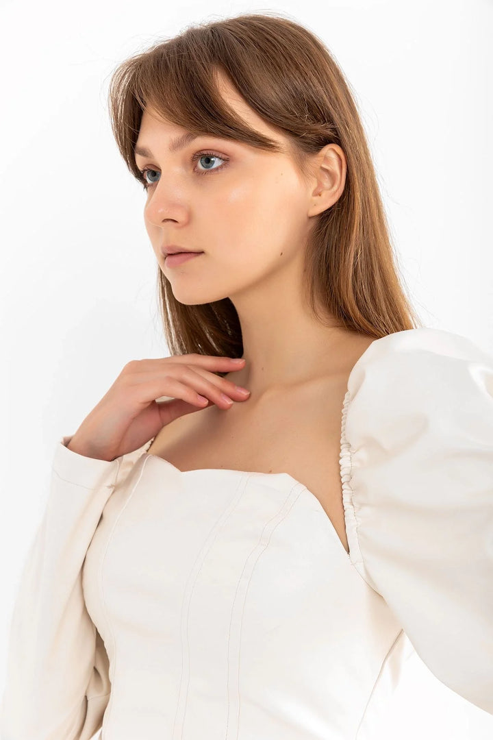 Deri Kumaş Uzun Kol Straplez Kalp Yaka Arkası Fermuar Detaylı Ekru Kadın Crop, şıklığı ve modern tasarımıyla göz dolduruyor. Kalp yaka ve straplez detayları, zarif bir siluet oluştururken, deri kumaşın sofistike dokusu şıklığı pekiştirir. Arkadaki fermuar detayı, hem estetik bir vurgu sağlar hem de pratik kullanım sunar. Toptan alım için mükemmel bir tercih olan bu crop, koleksiyonunuza şık bir dokunuş katacak. Müşterileriniz hoş görünüme sahip bu crop'u özel davetler, gece etkinlikleri veya şık günlük kombinlerinde rahatça kullanabilirler. Sezonun trendlerine uygun bu ürün, moda tutkunlarının dikkatini çekecek ve gardıroplarının yıldızı olacak.