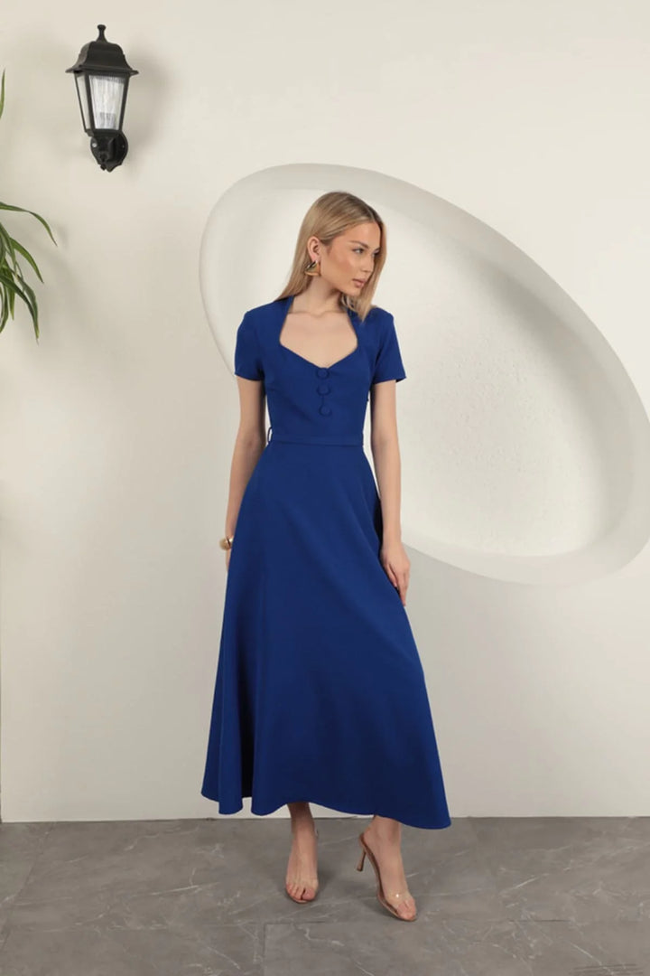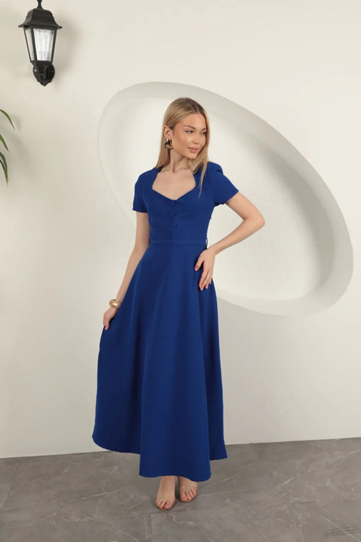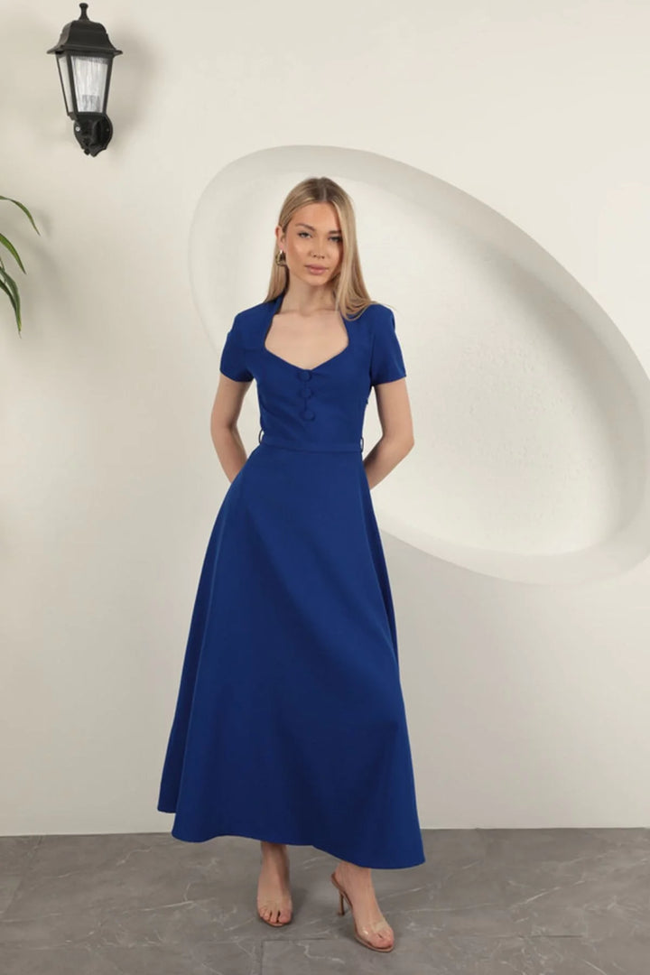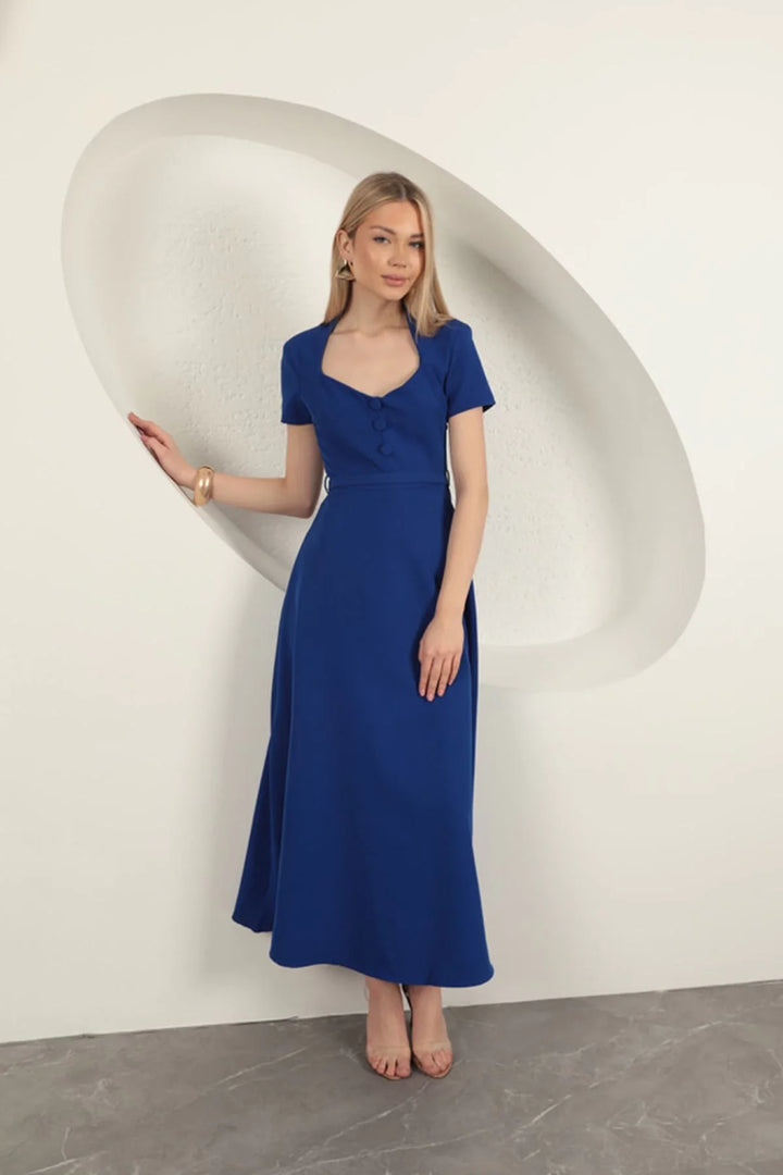 Double Atlas Kumaş Kemerli Elbise-Saks