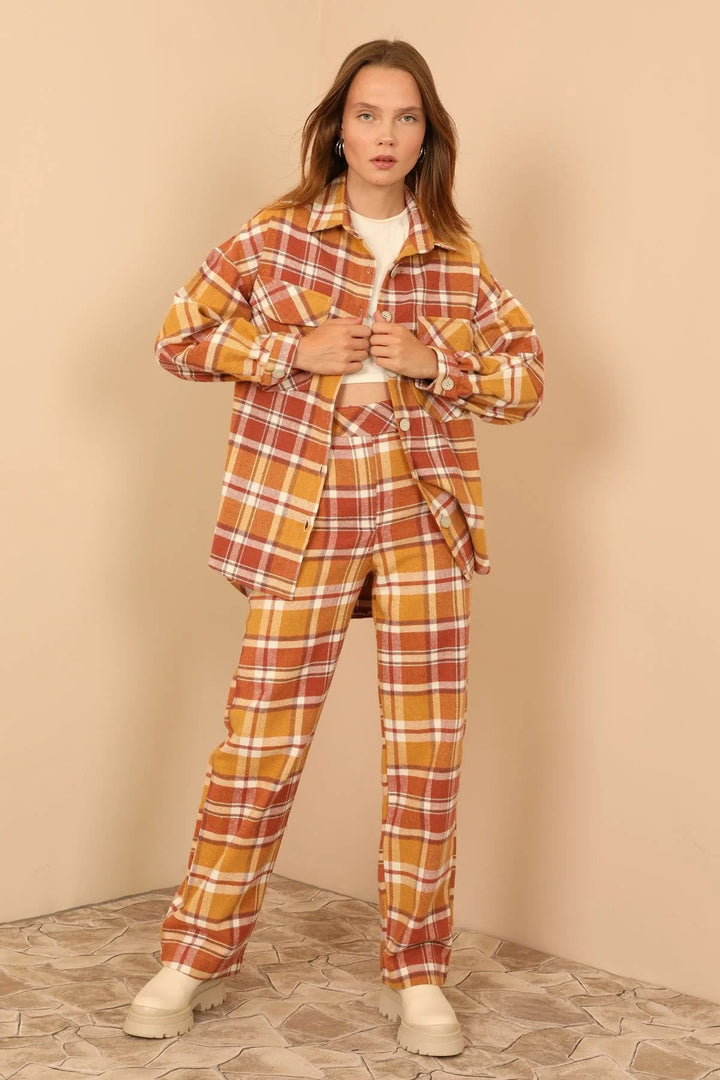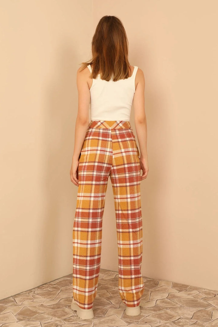 Ekose Kumaş Rahat Kalıp Kadın Pantolon-Taba