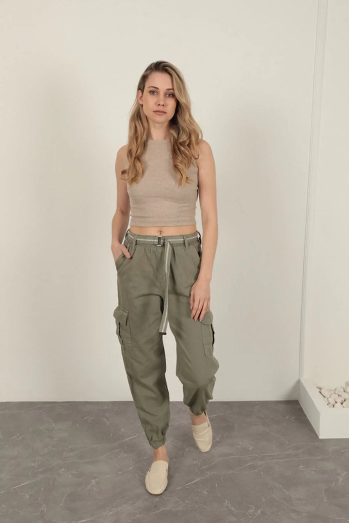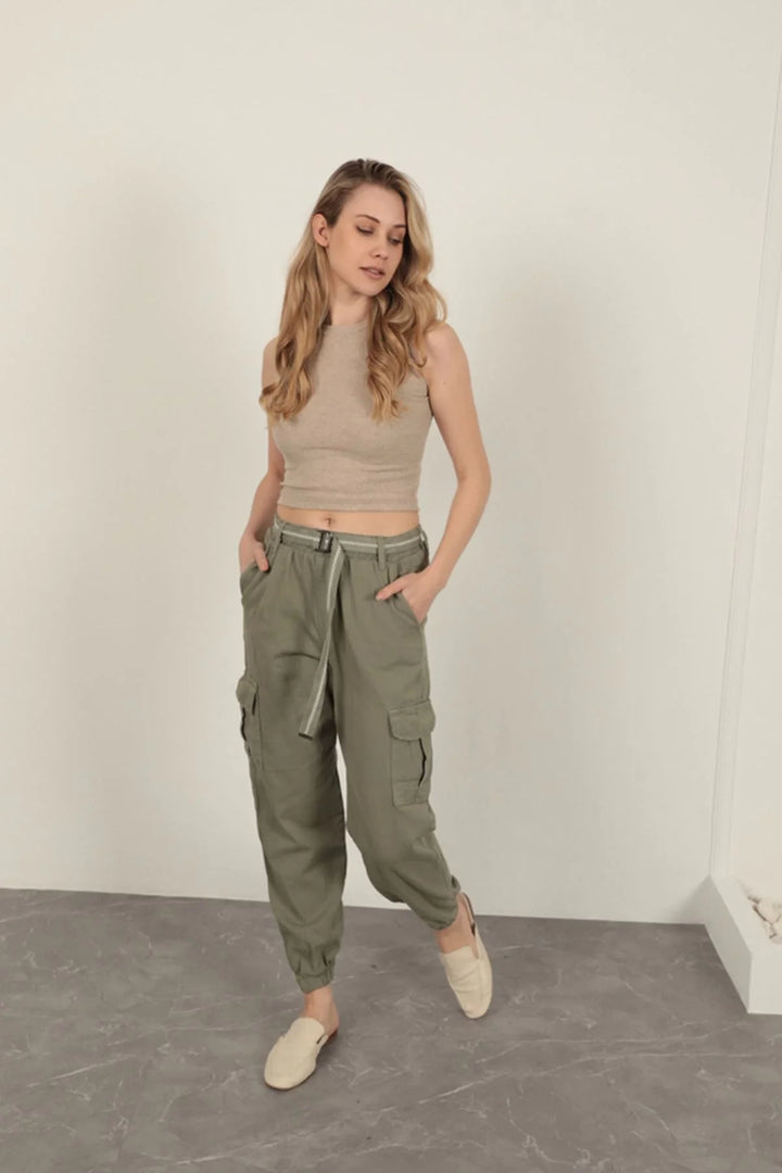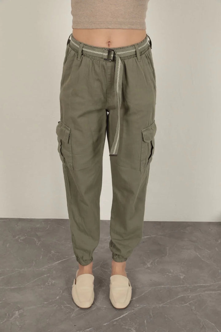 Gabardin Kumaş Kemerli Kargo Kadın Pantolon-Haki
