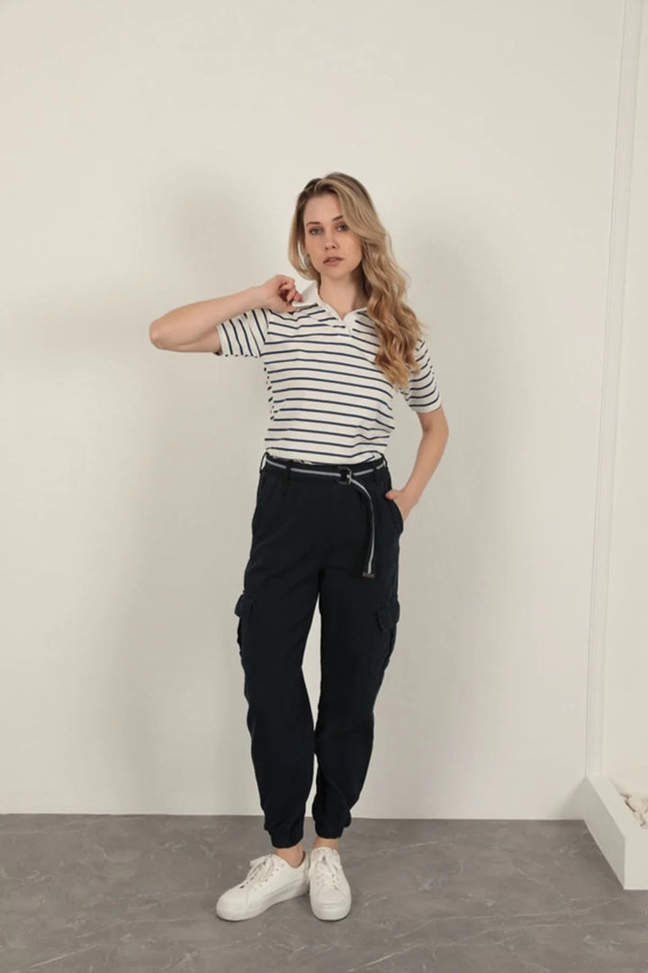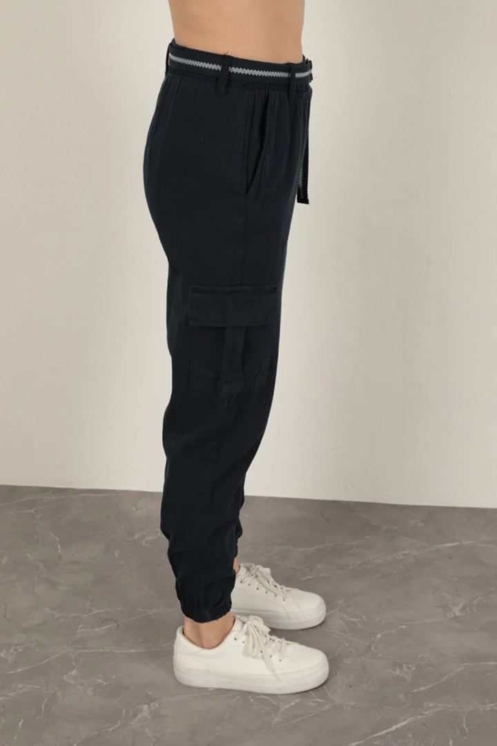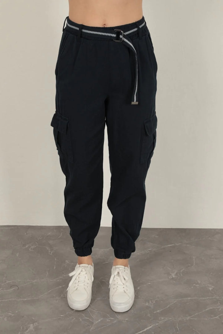 Gabardin Kumaş Kemerli Kargo Kadın Pantolon-Lacivert