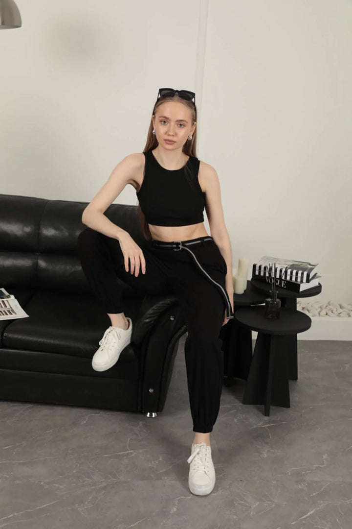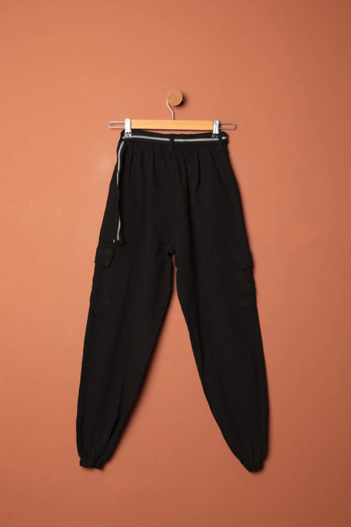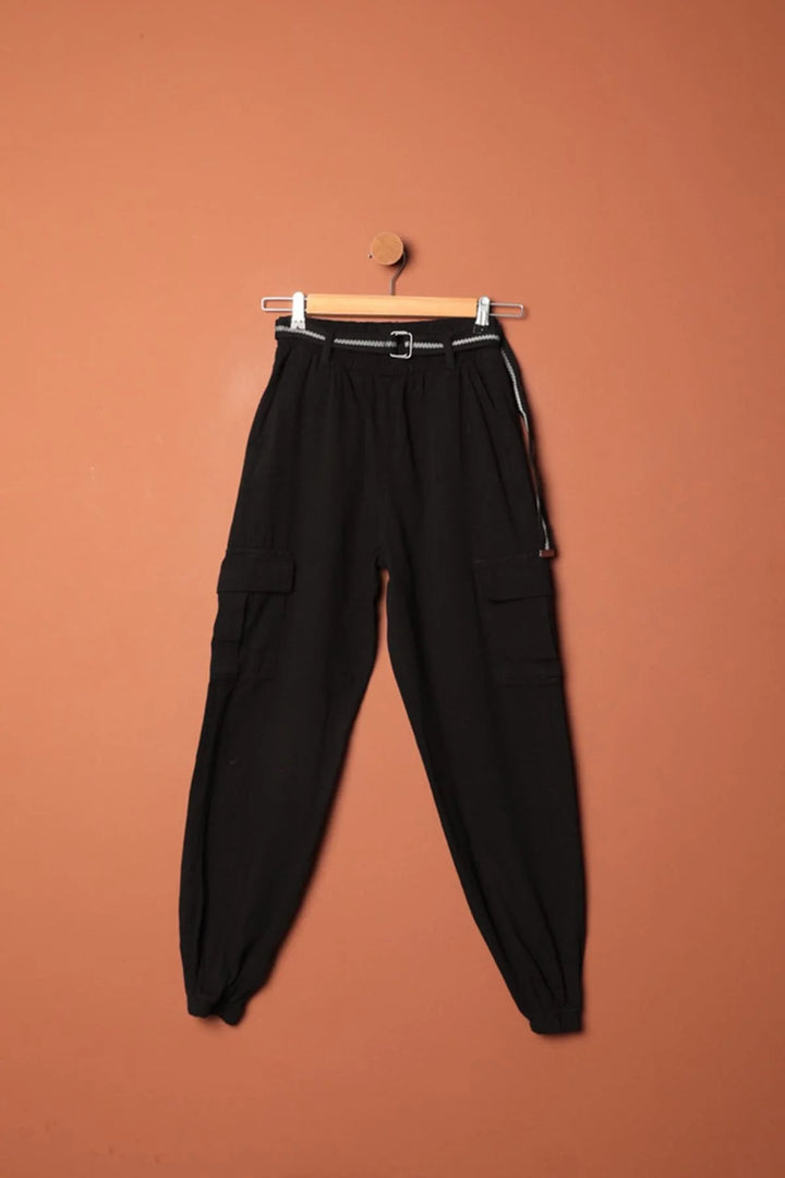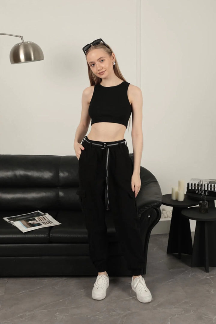 Gabardin Kumaş Kemerli Kargo Kadın Pantolon-Siyah