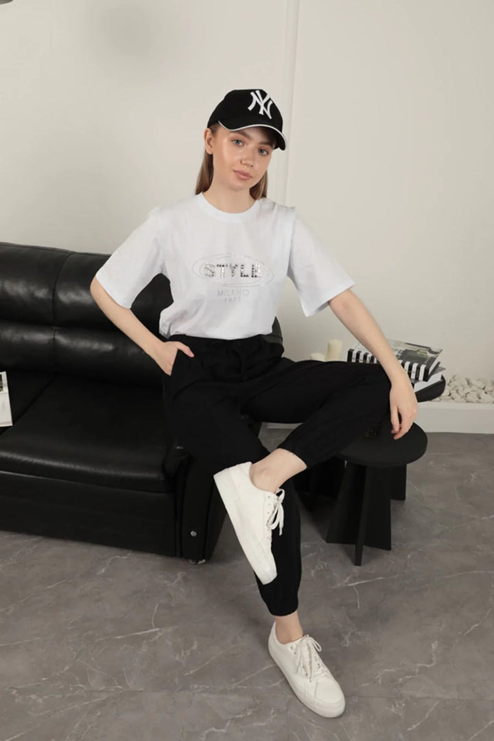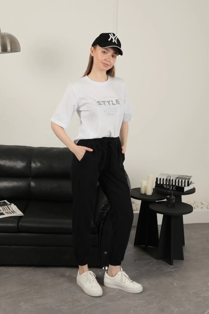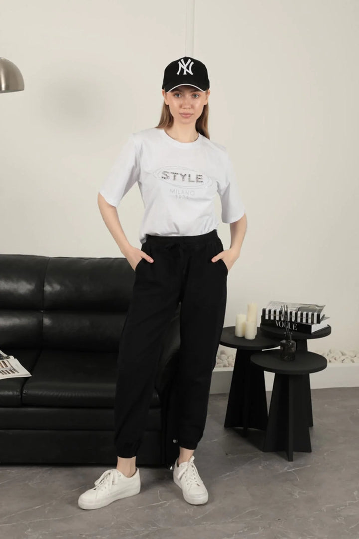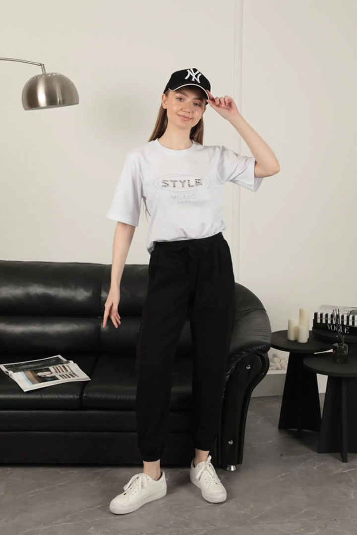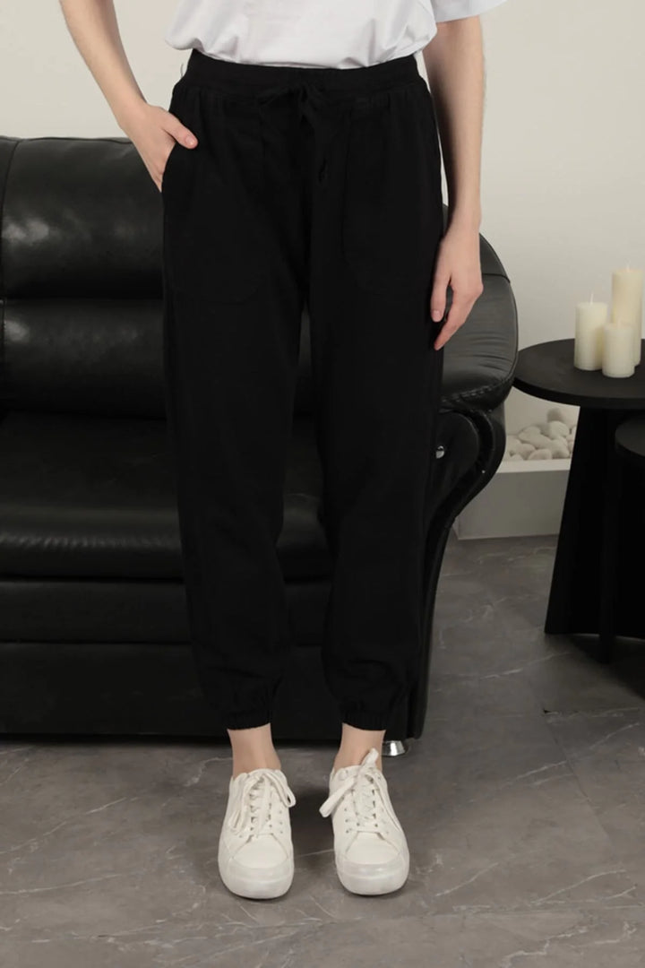 Gabardin Kumaş Paçası Lastikli Kadın Pantolon-Siyah