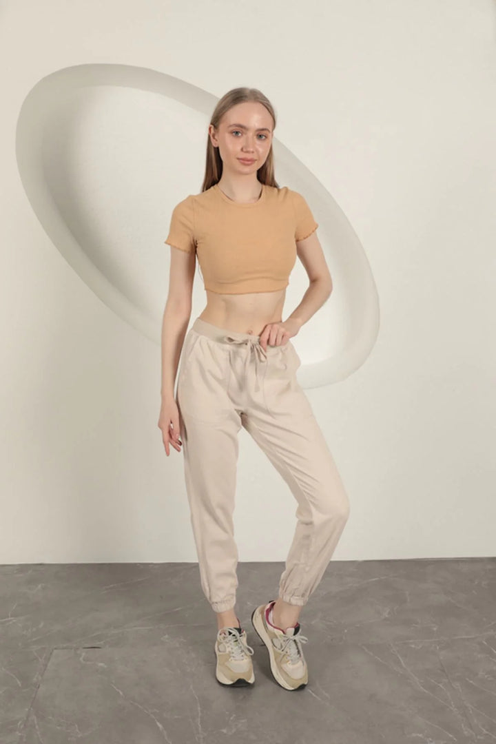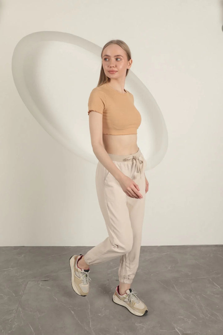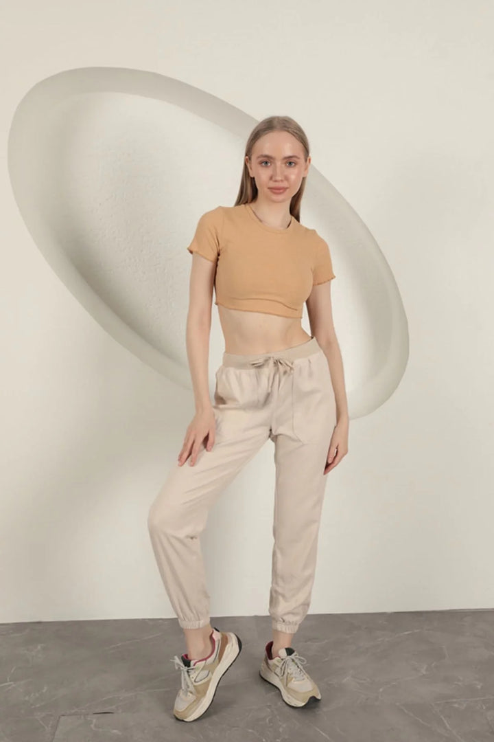 Gabardin Kumaş Paçası Lastikli Kadın Pantolon-Taş