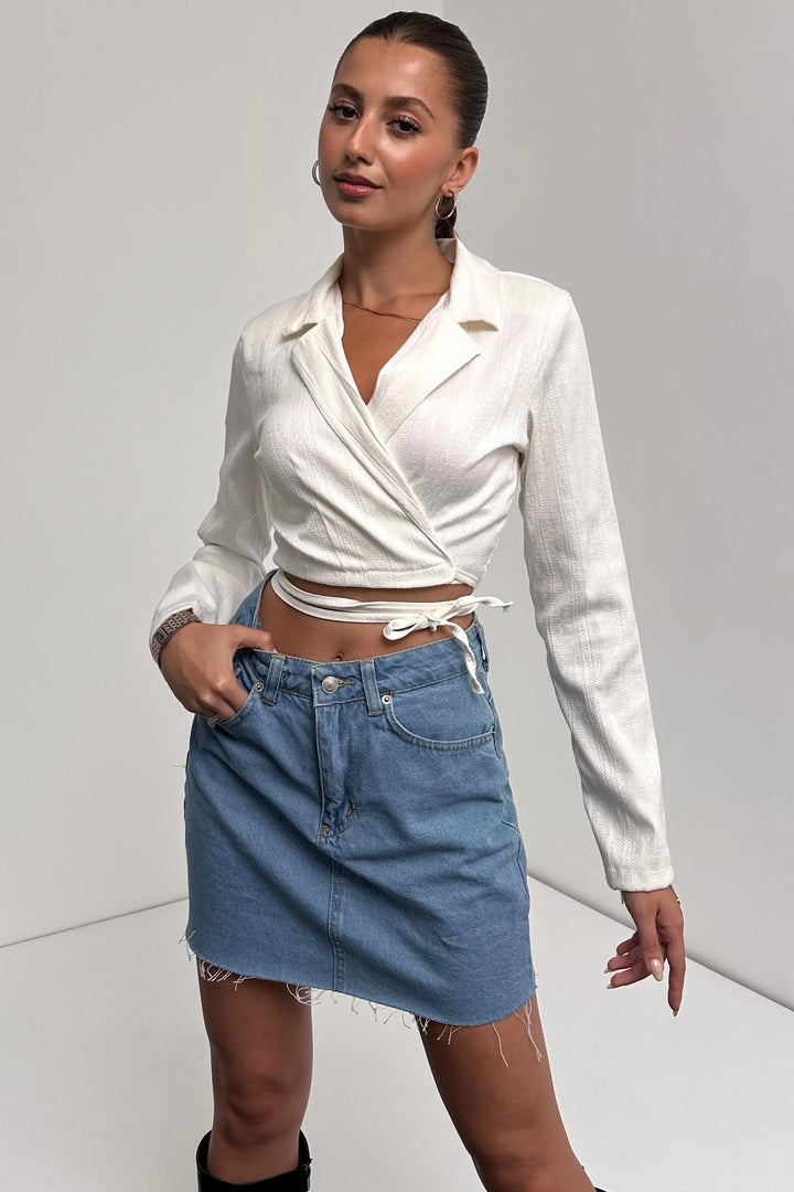 Gömlek Yaka Beli Bağlamalı Crop Bluz