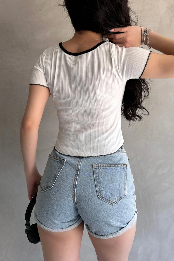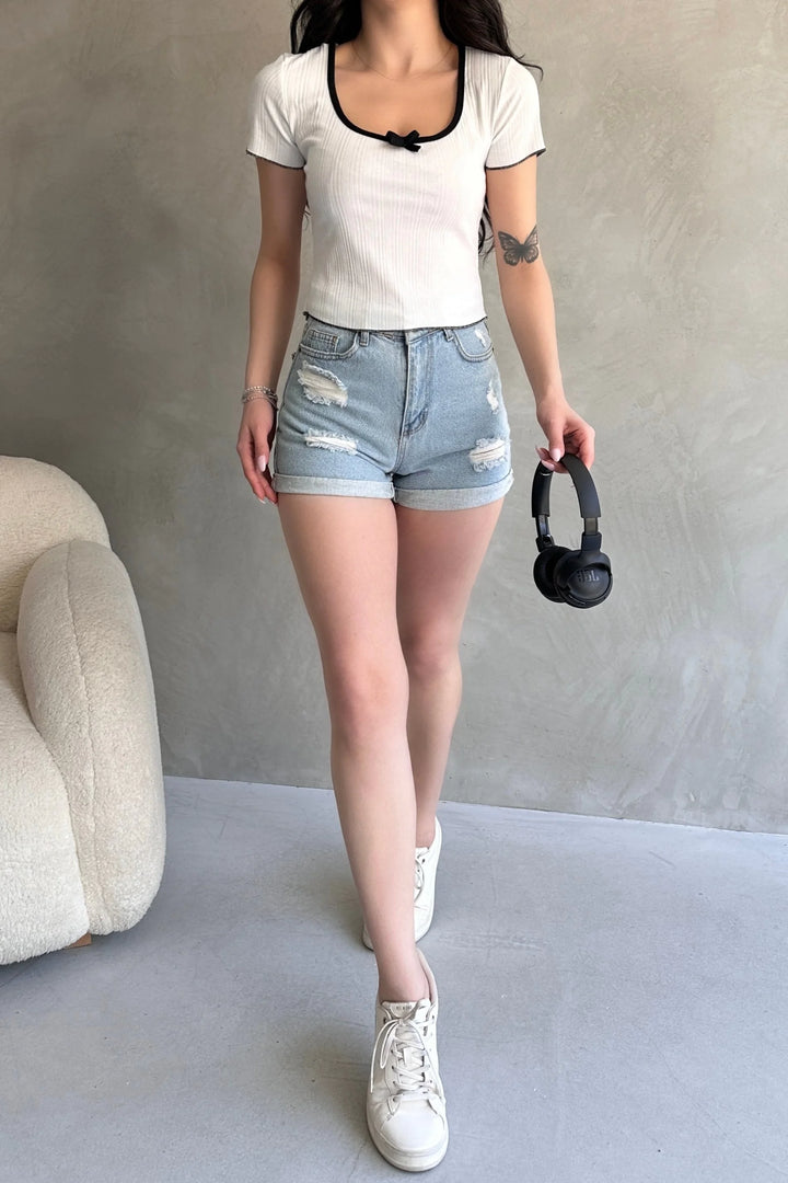 Havuz Yaka Biye Detaylı Crop Bluz