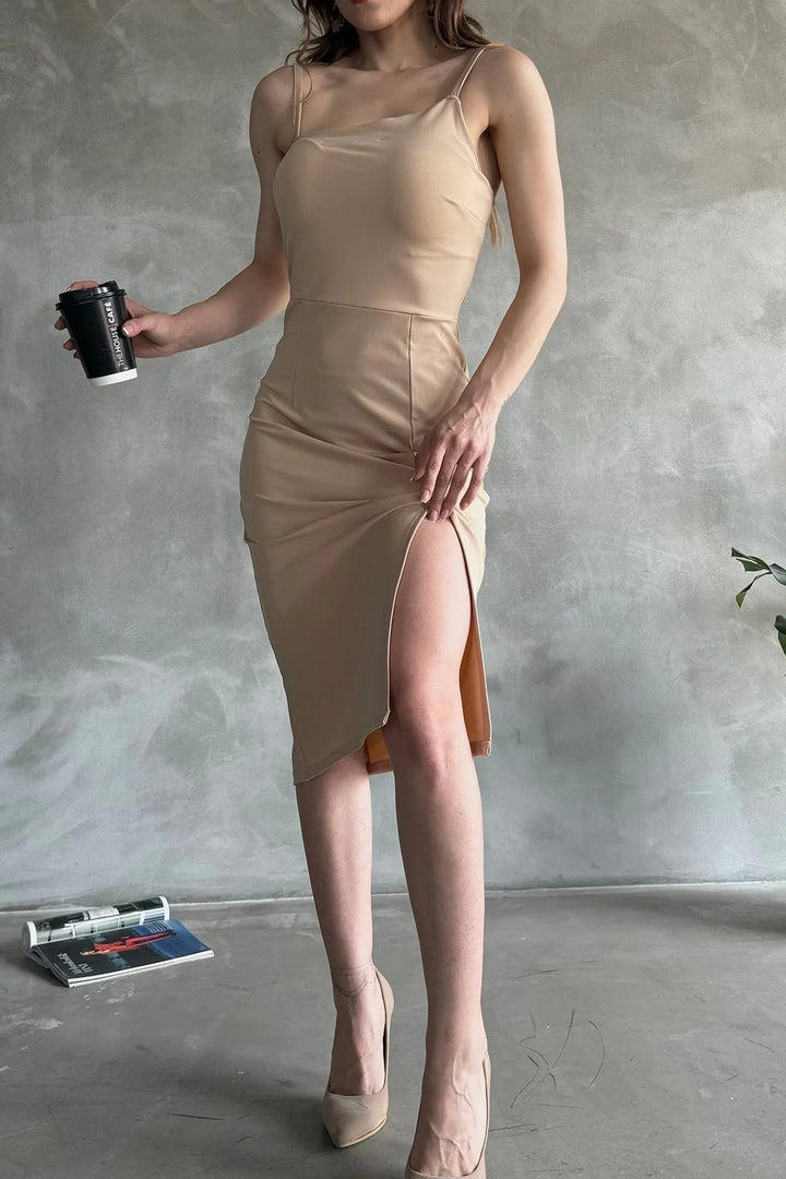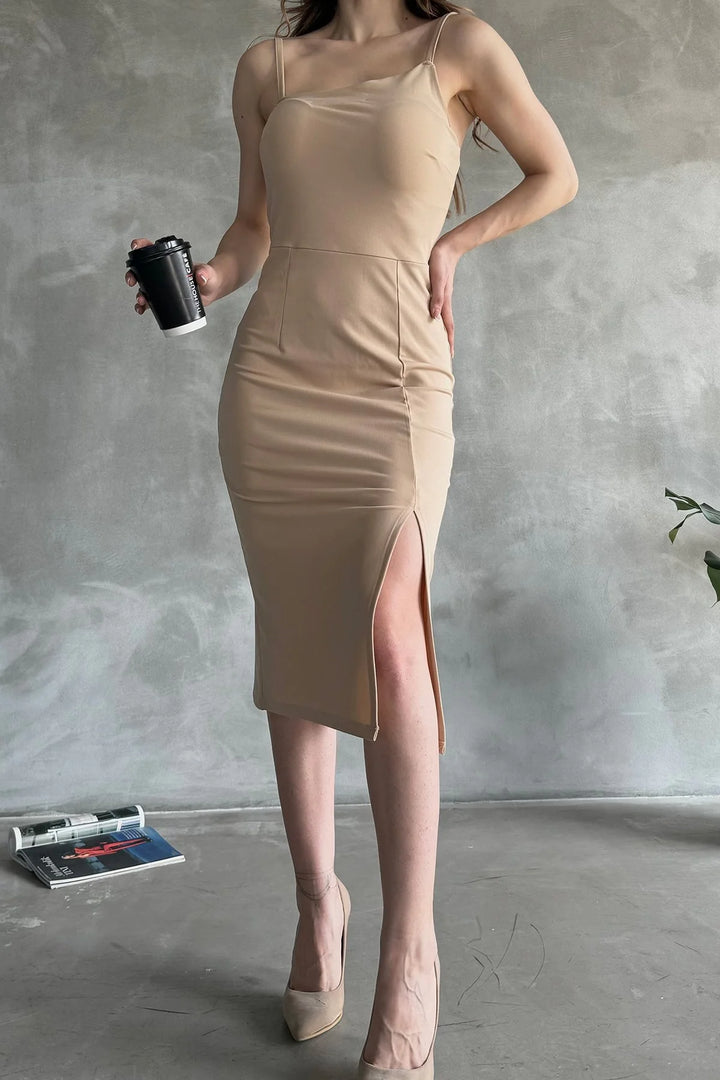 İp Askılı Yırtmaç Detaylı Midi Boy Dalgıç Elbise