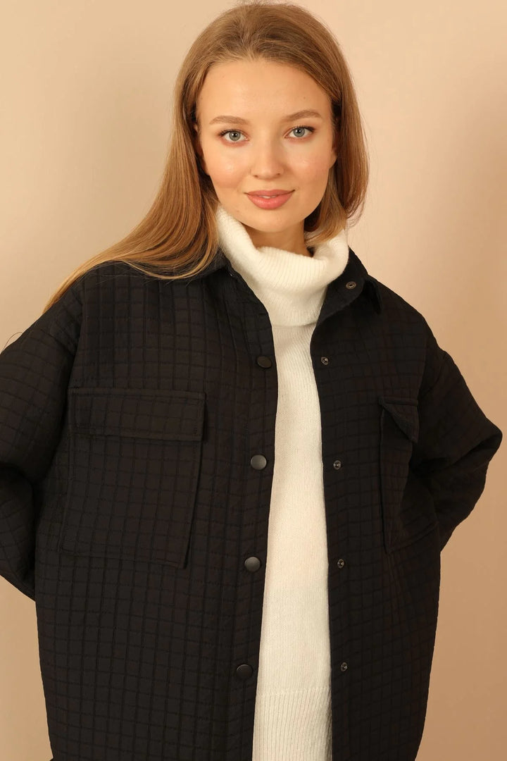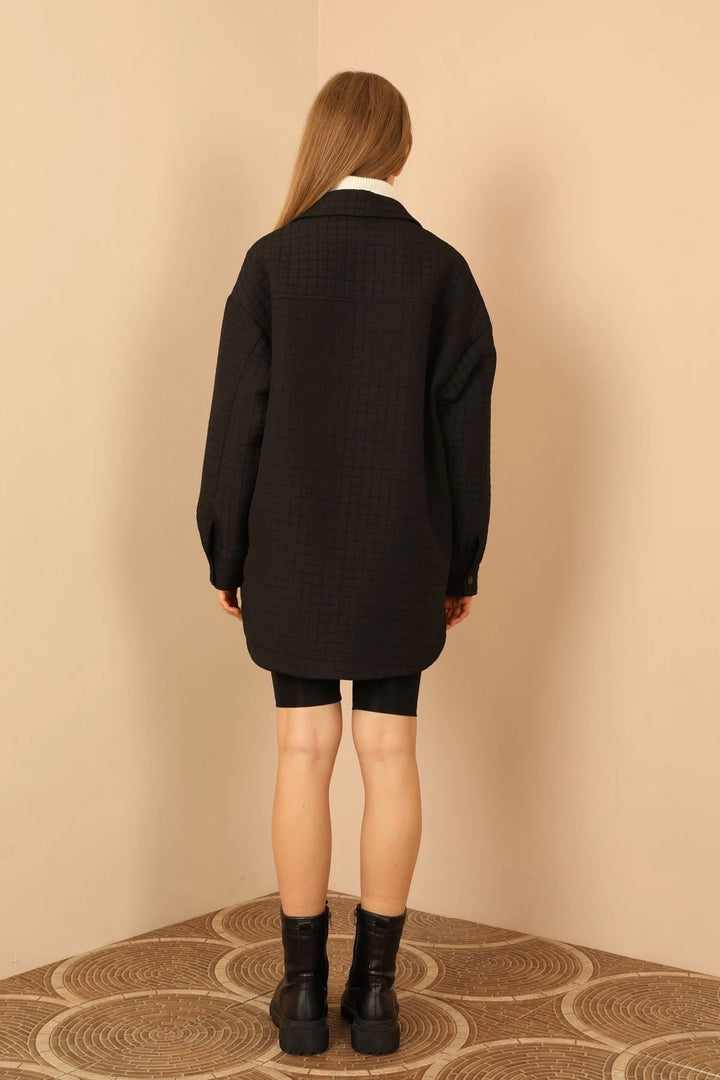 Jakar Kumaş Küçük Kare Desen Oversize Kadın Gömlek-Siyah