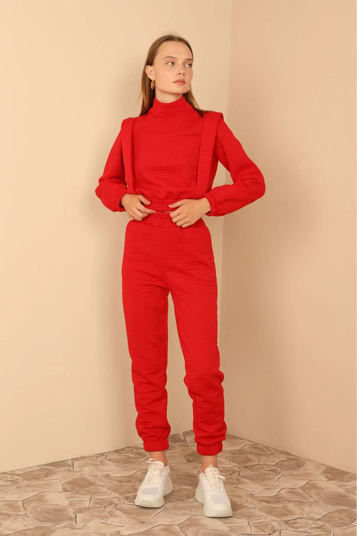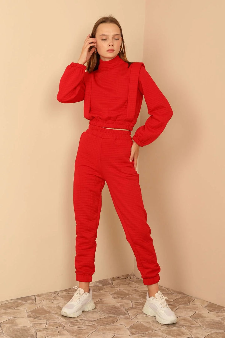 Kapitone Kumaş Boğazlı Yaka Omuz Detaylı Kadın Takım-Kırmızı