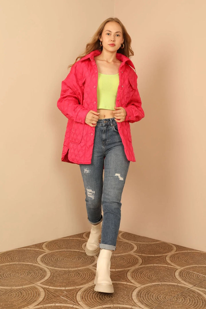 Kapitone Kumaş Çift Dikiş Desen Kadın Mont-Fuşya