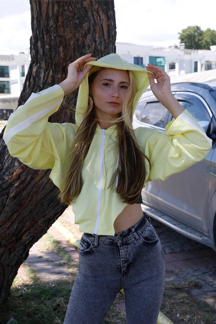 Kapşonlu Yan Dekolteli Sweat Sarı - P-019669