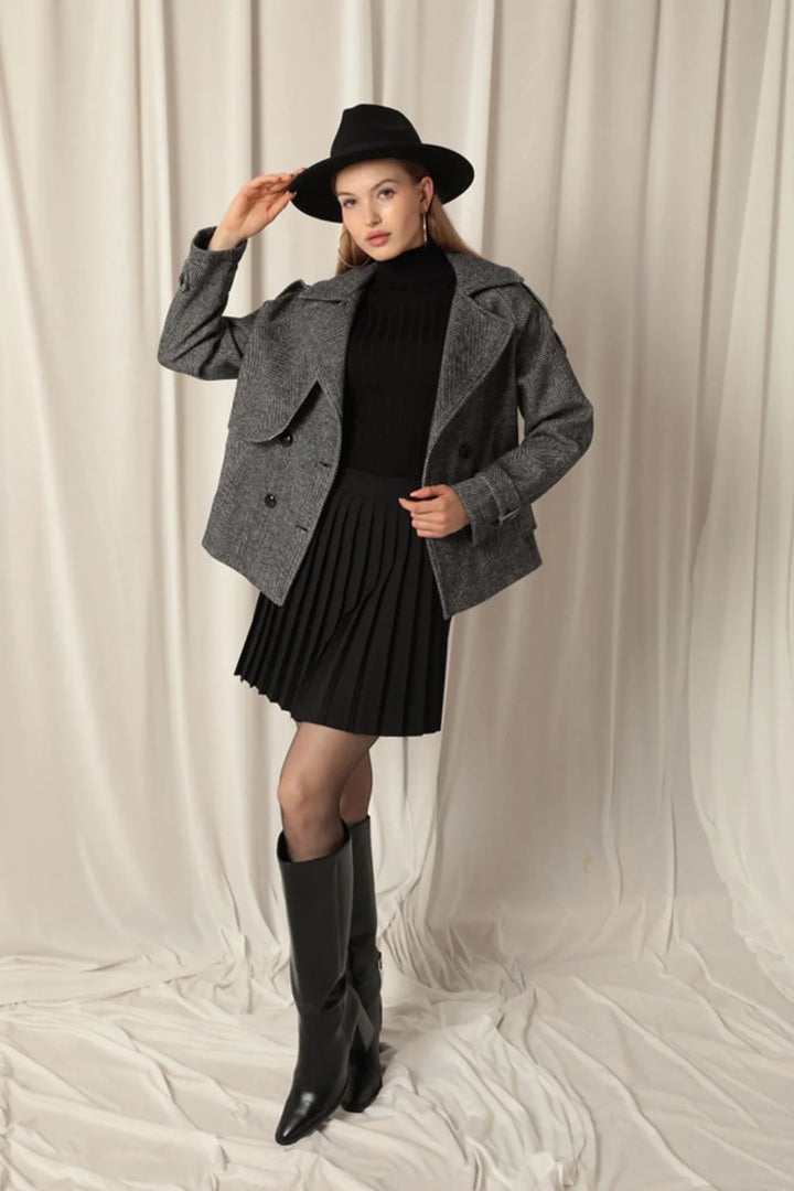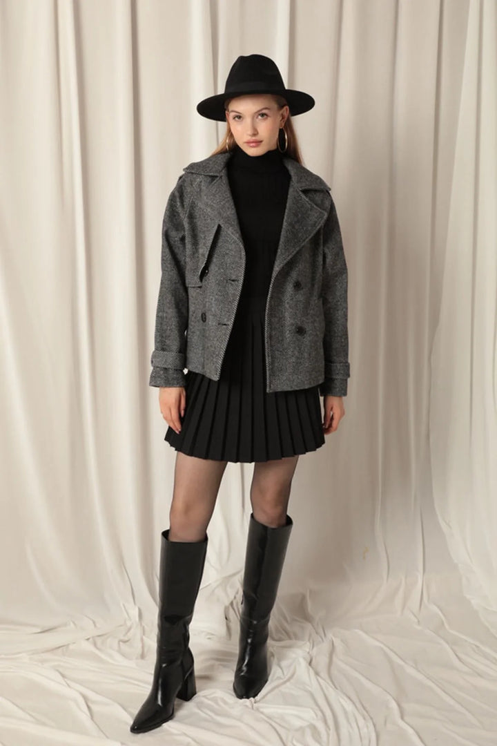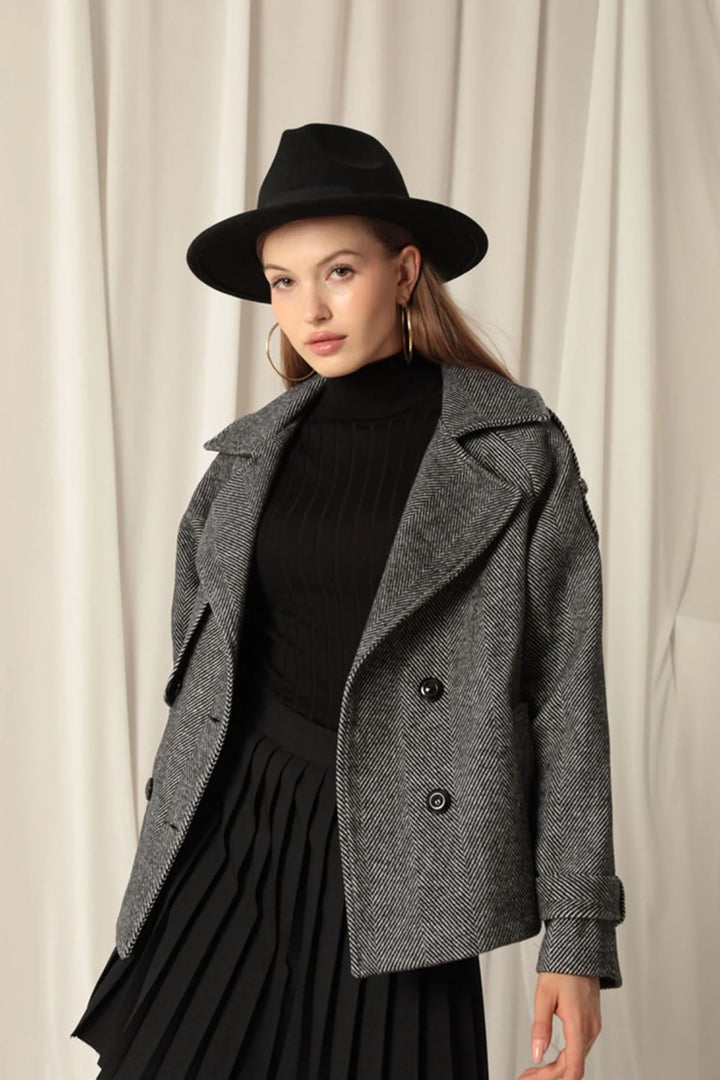 Kaşe Kumaş Balıksırtı Desen Kısa Kadın Siyah Kaban