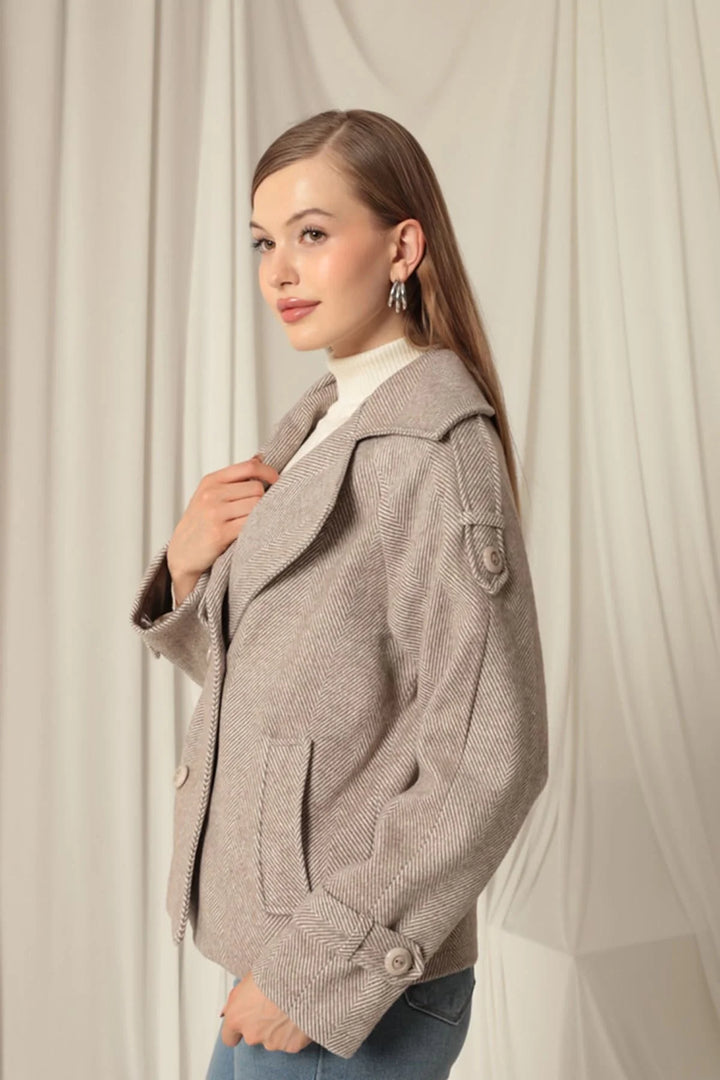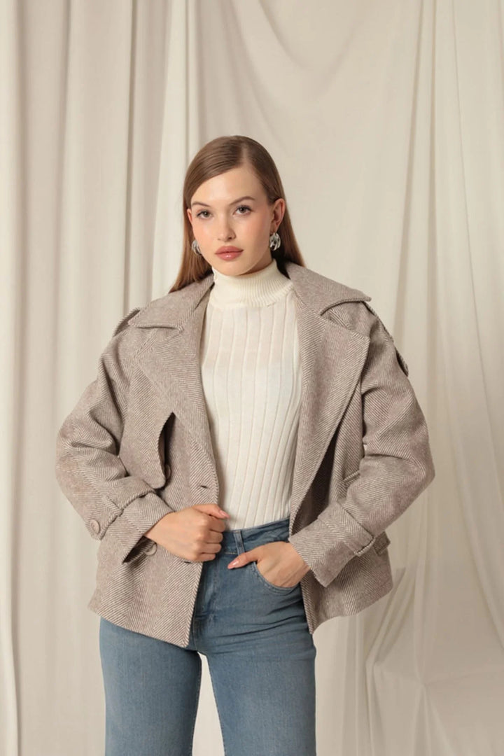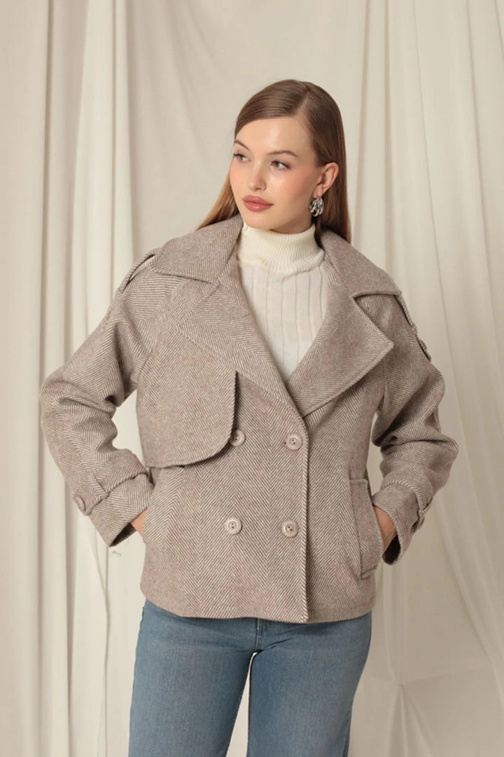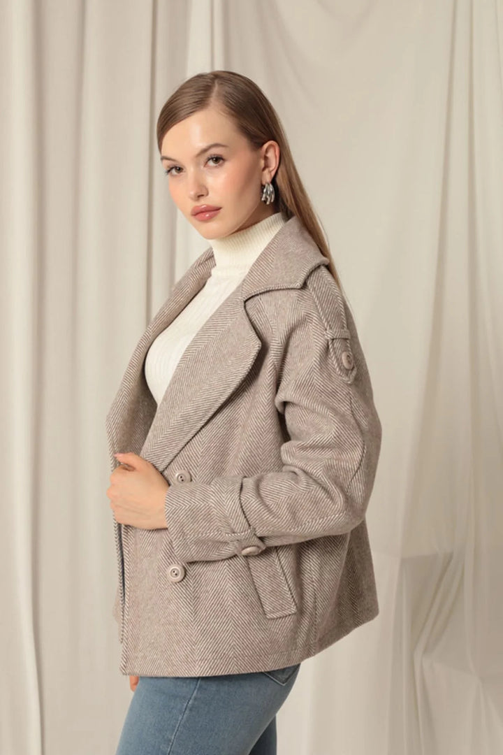 Kaşe Kumaş Balıksırtı Desen Kısa Kadın Vizon Kaban