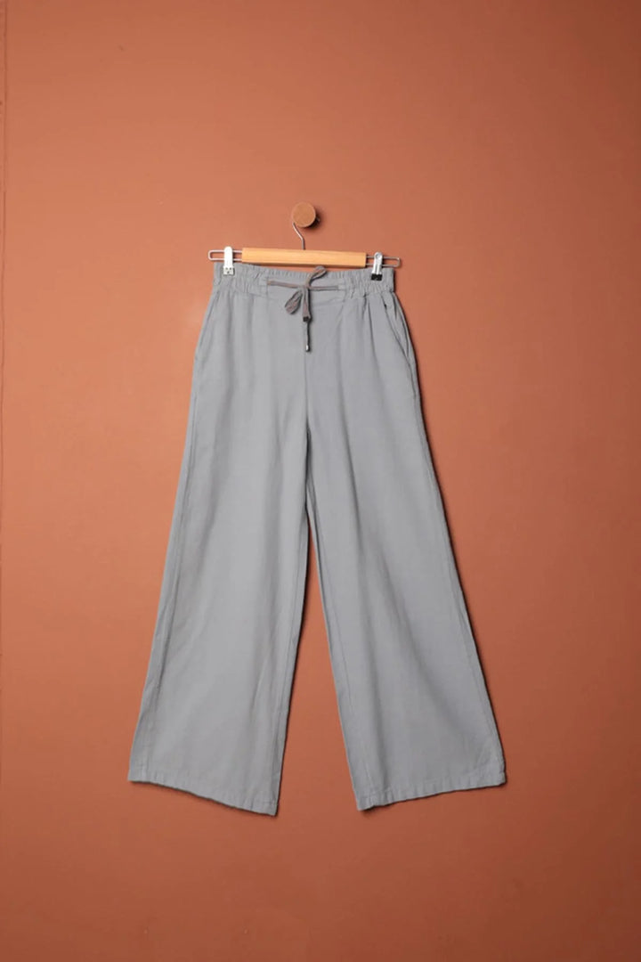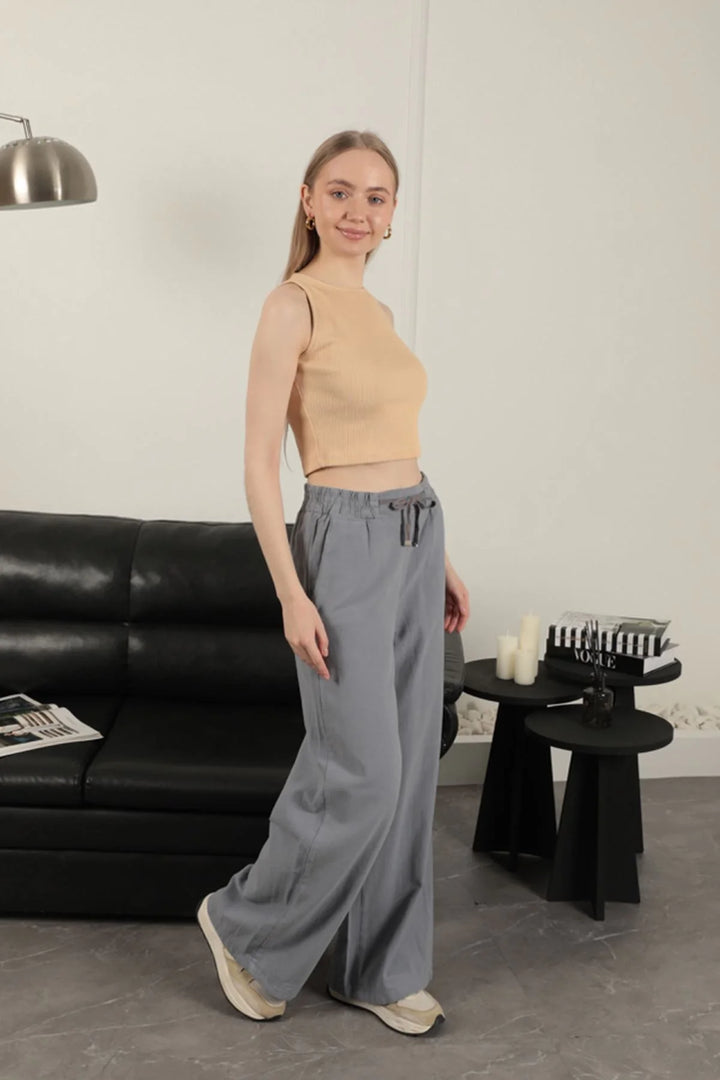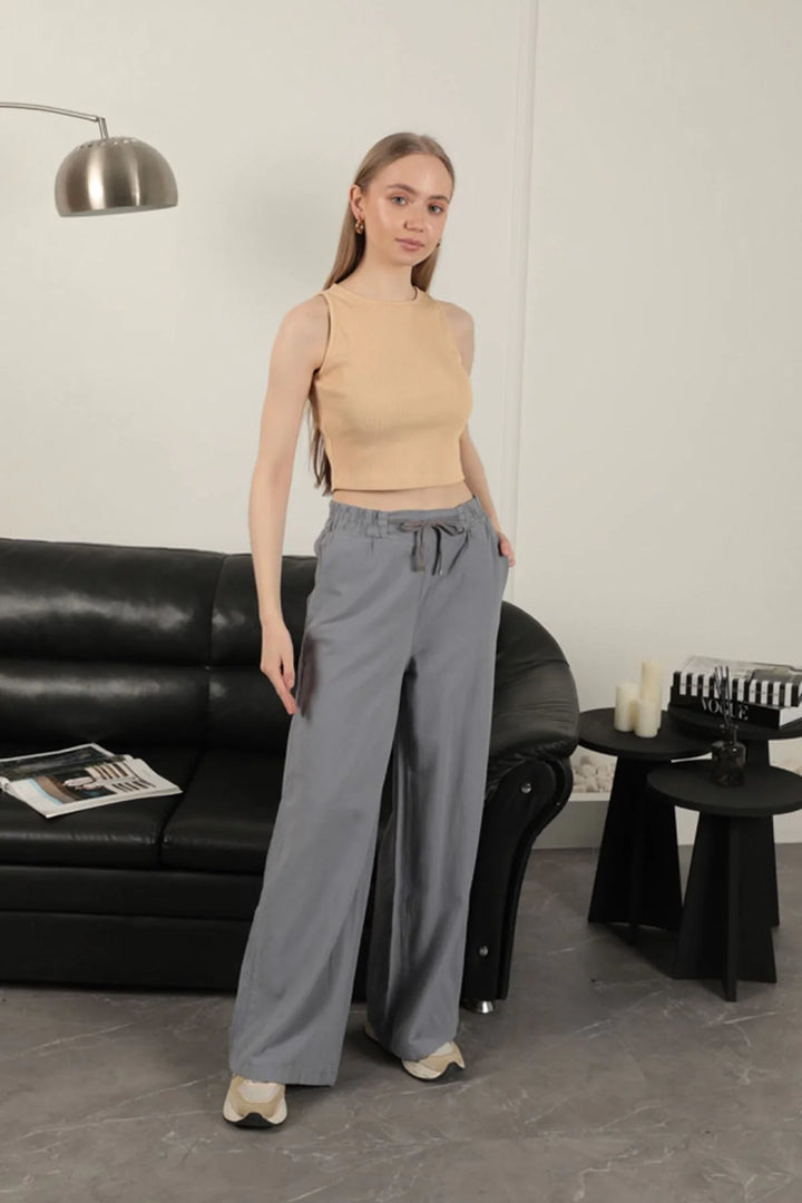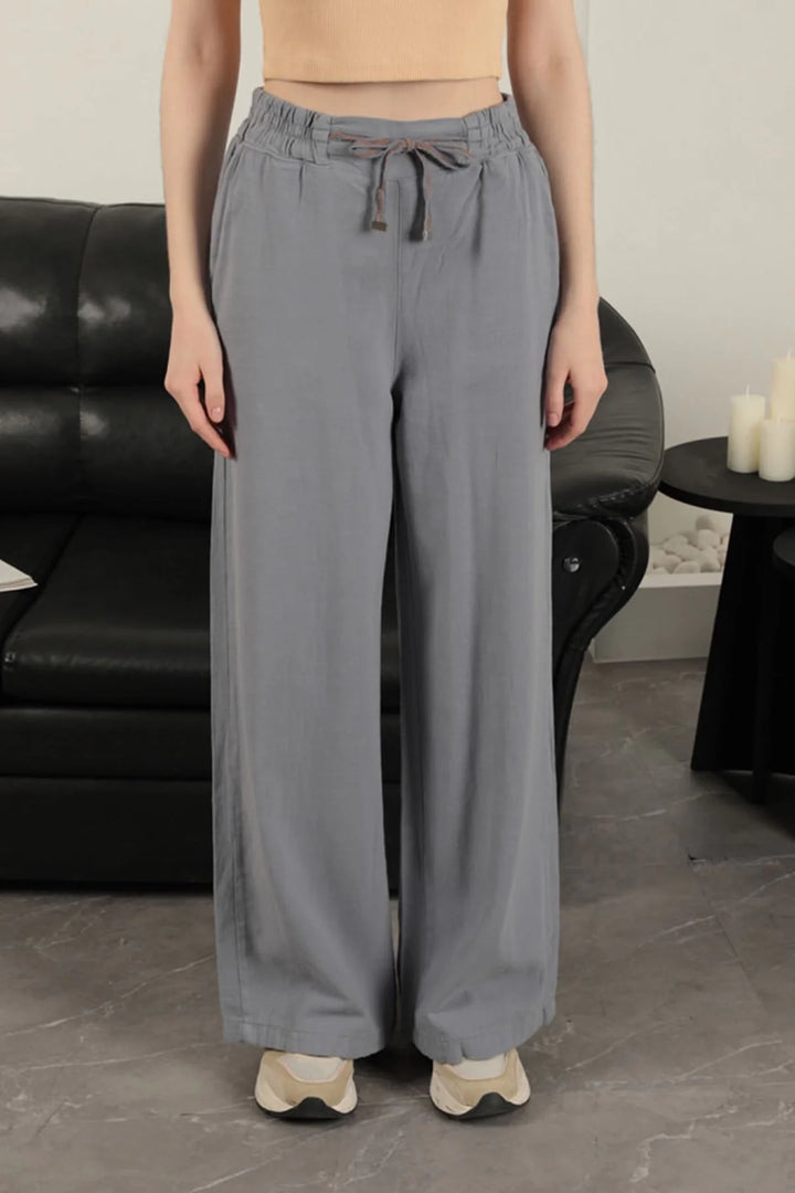 Keten Kumaş Bol Paça Kadın Pantolon-Gri