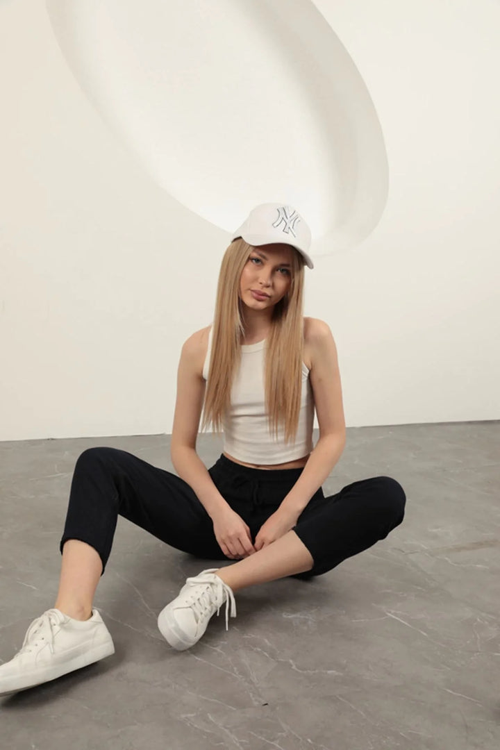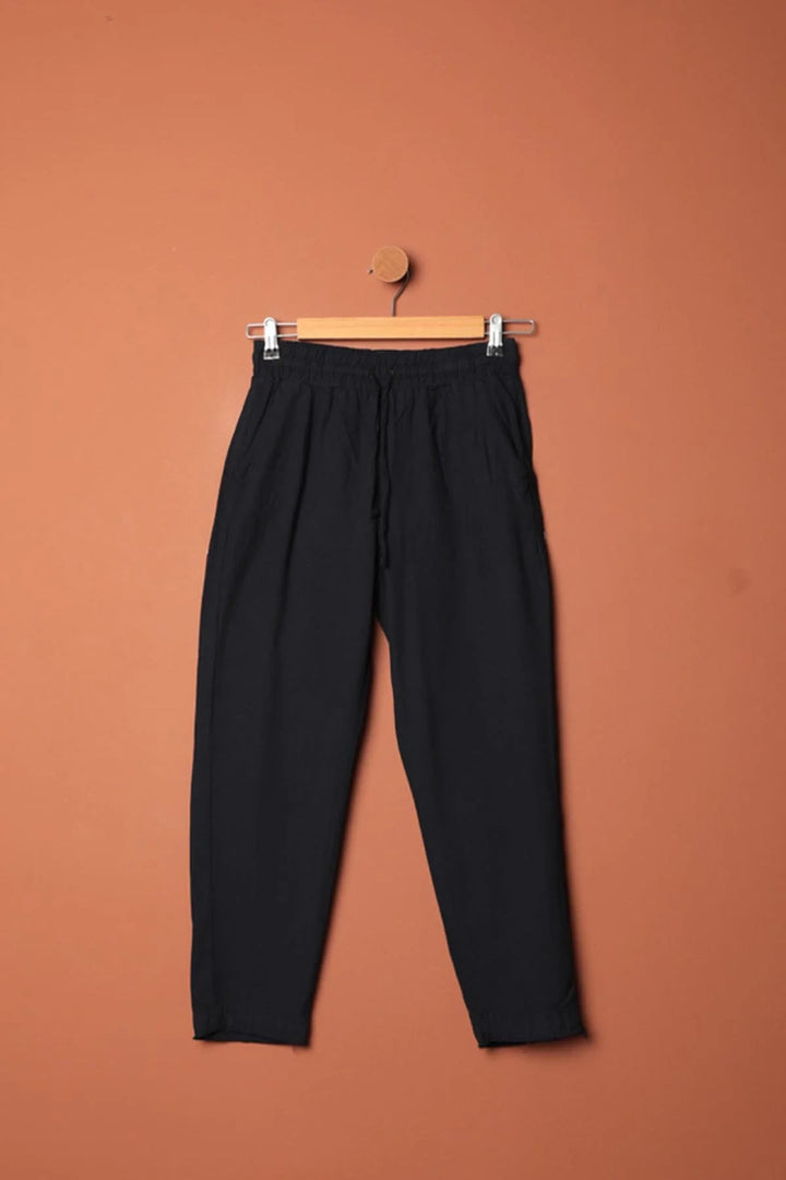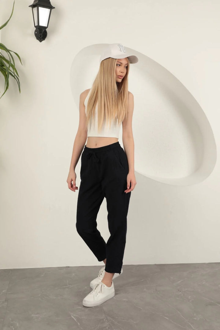 Keten Kumaş Püsküllü Paça Kadın Pantolon-Lacivert