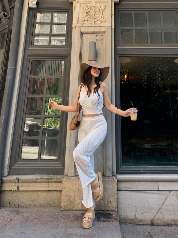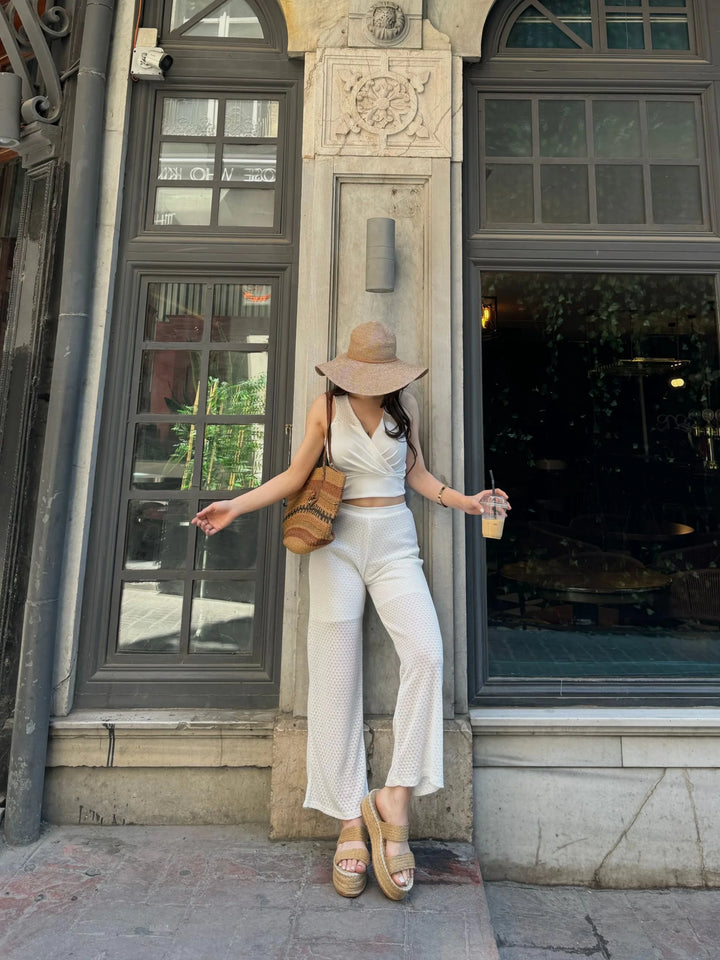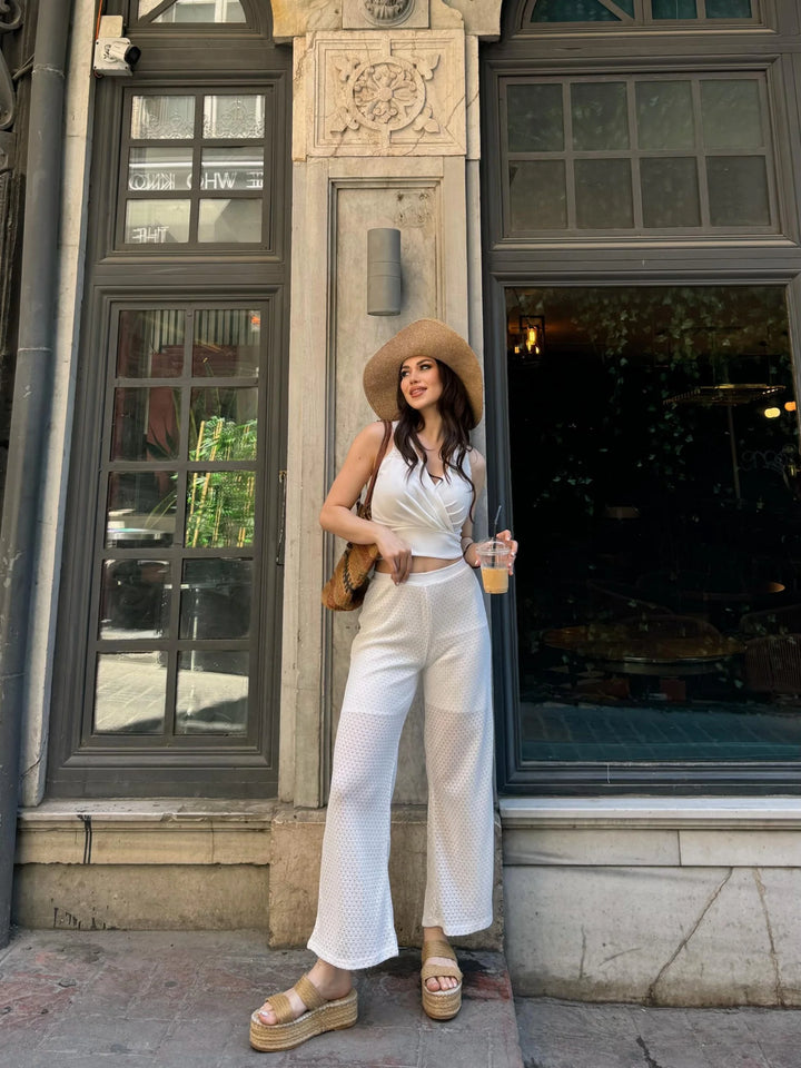 Kruvaze Yaka Crop Bluz Ve Detaylı Pantolon Triko İkili Takım