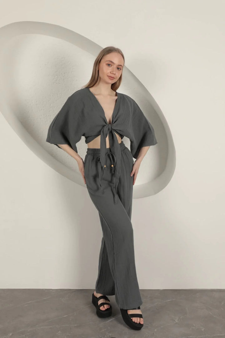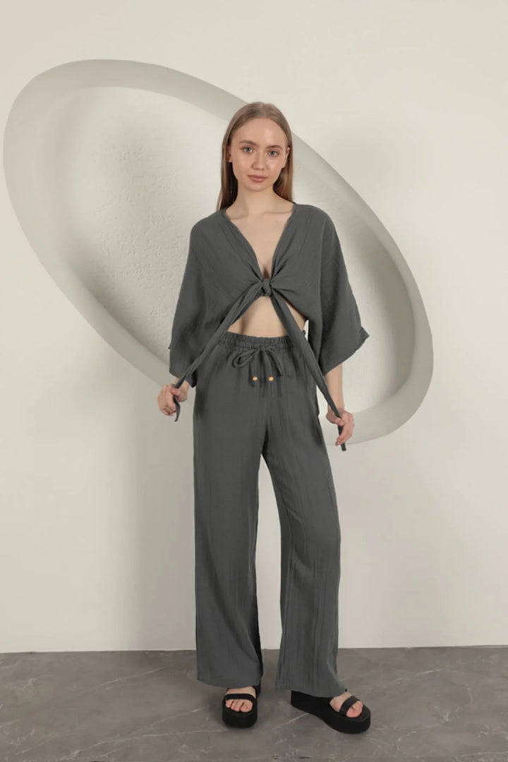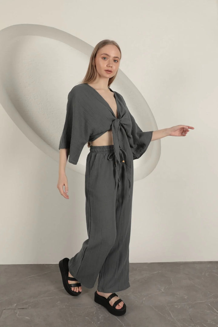 Müslin Kumaş Bol Paça Kadın Pantolon-Antrasit