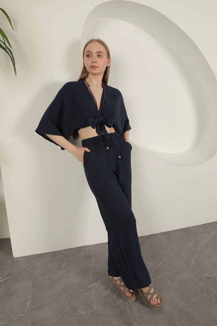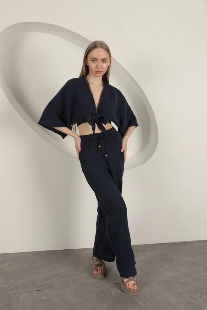 Müslin Kumaş Bol Paça Kadın Pantolon-Lacivert