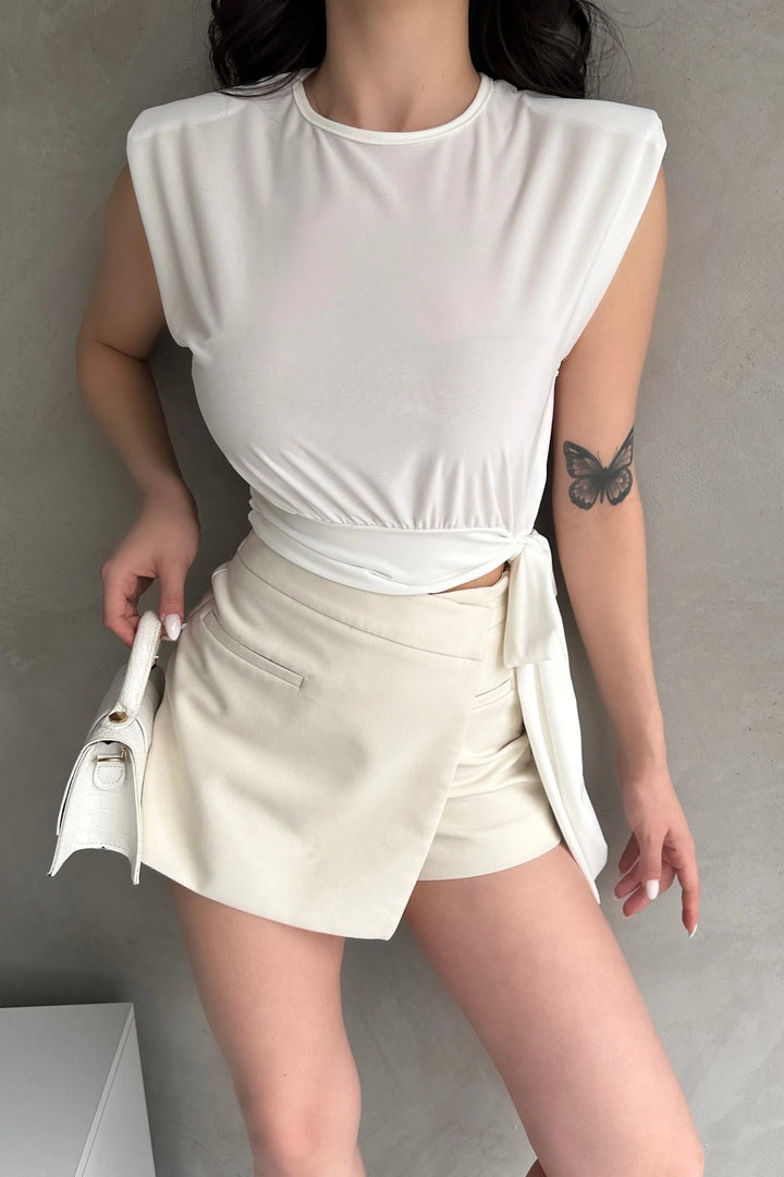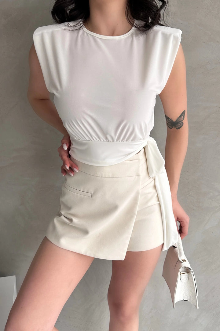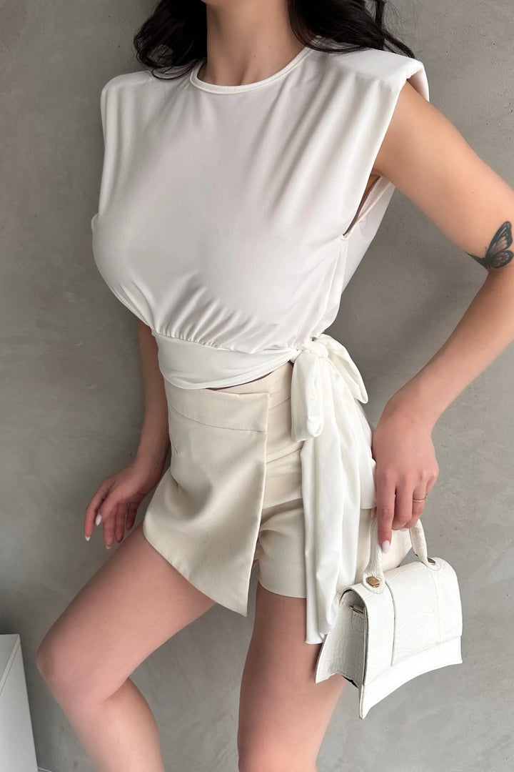 Omuzu Vatkalı Beli Kuşaklı Bluz