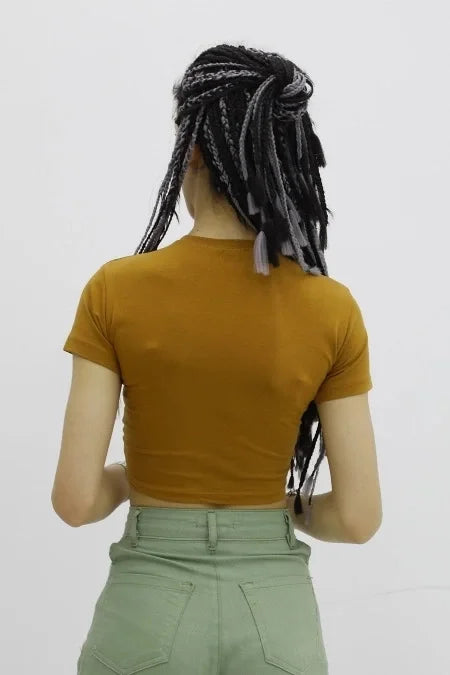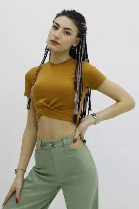 Önü Büzgülü Bisiklet Yaka Tshirt Taba - P-019963
