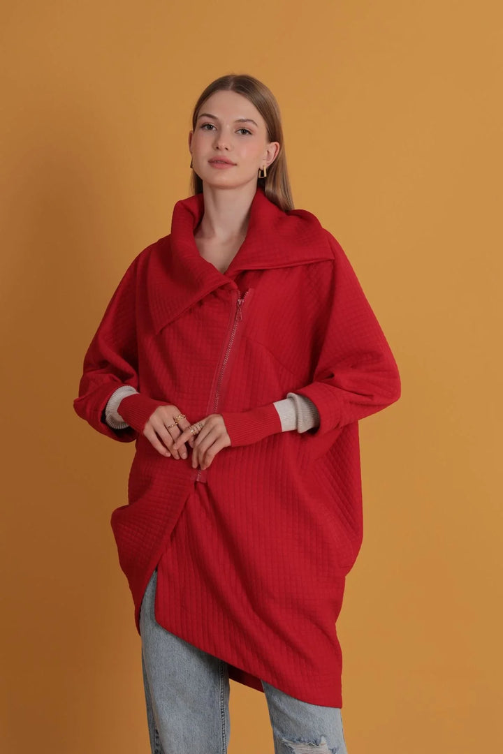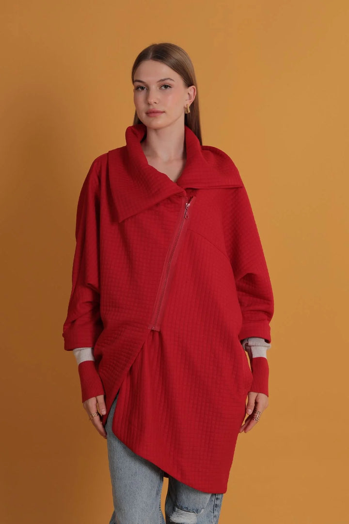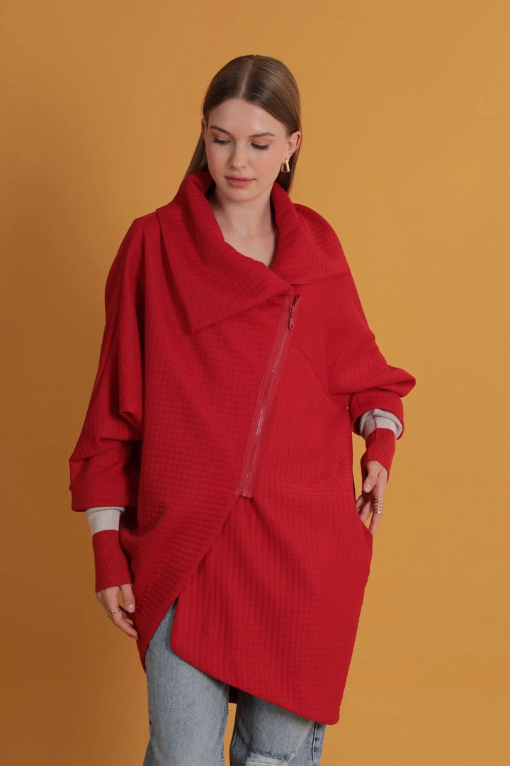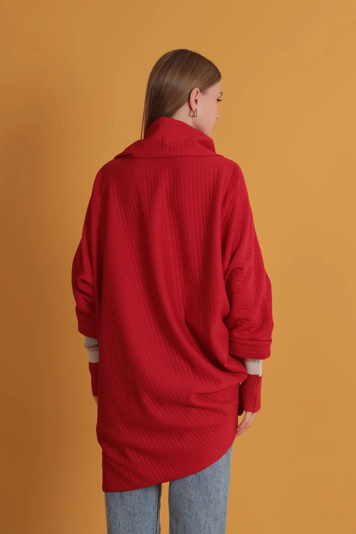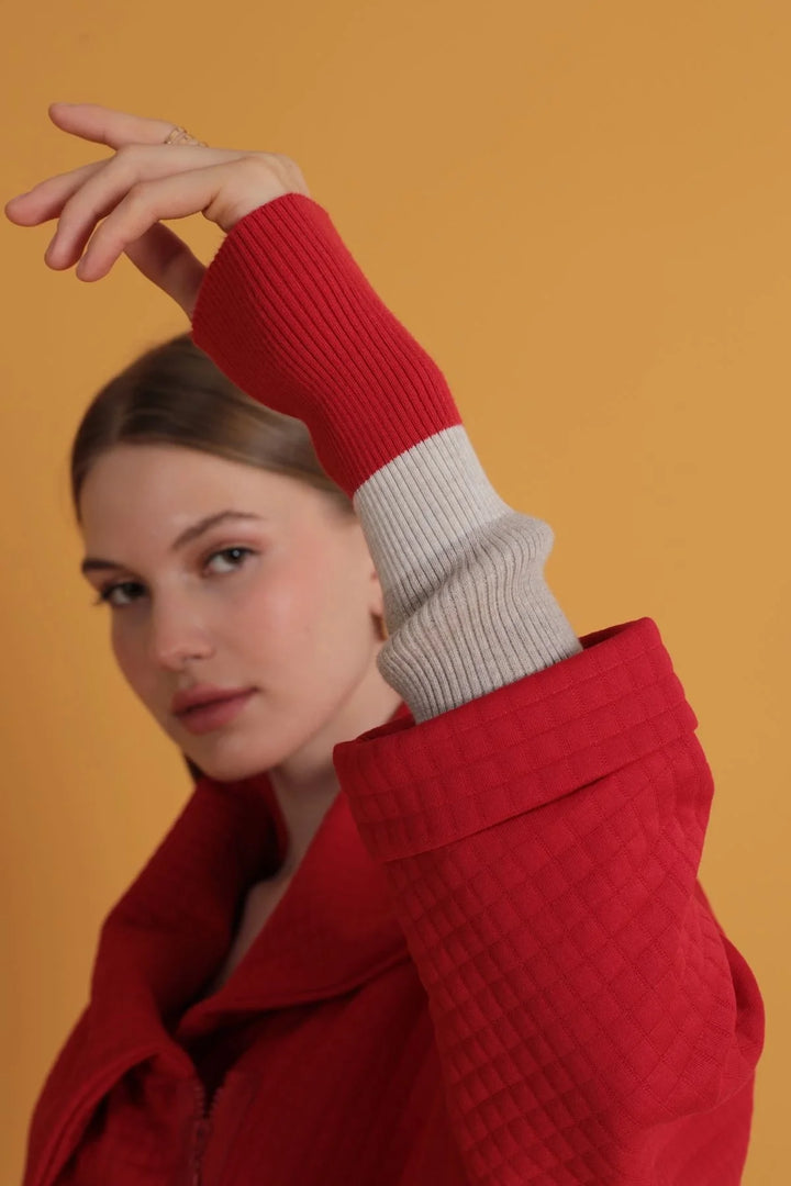 Petek Kumaş Kolu Ribana Detaylı Kadın Hırka-Kırmızı