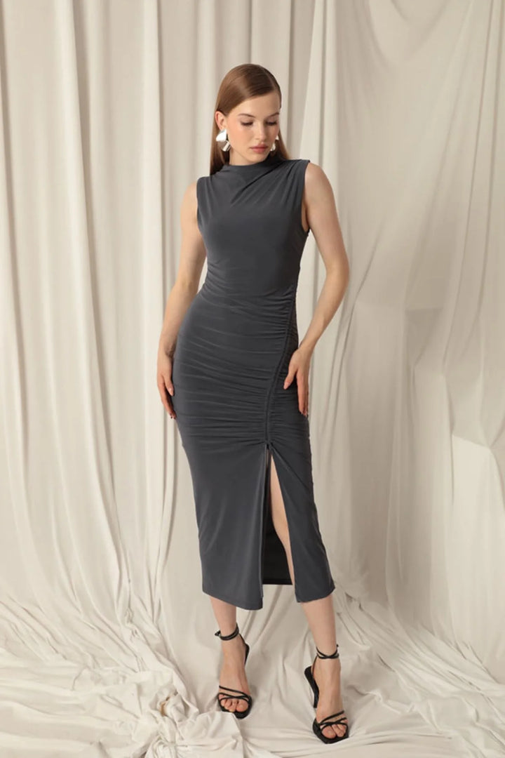 Sandy Kumaş Balıkçı Yaka Maxi Kadın Antrasit Elbise