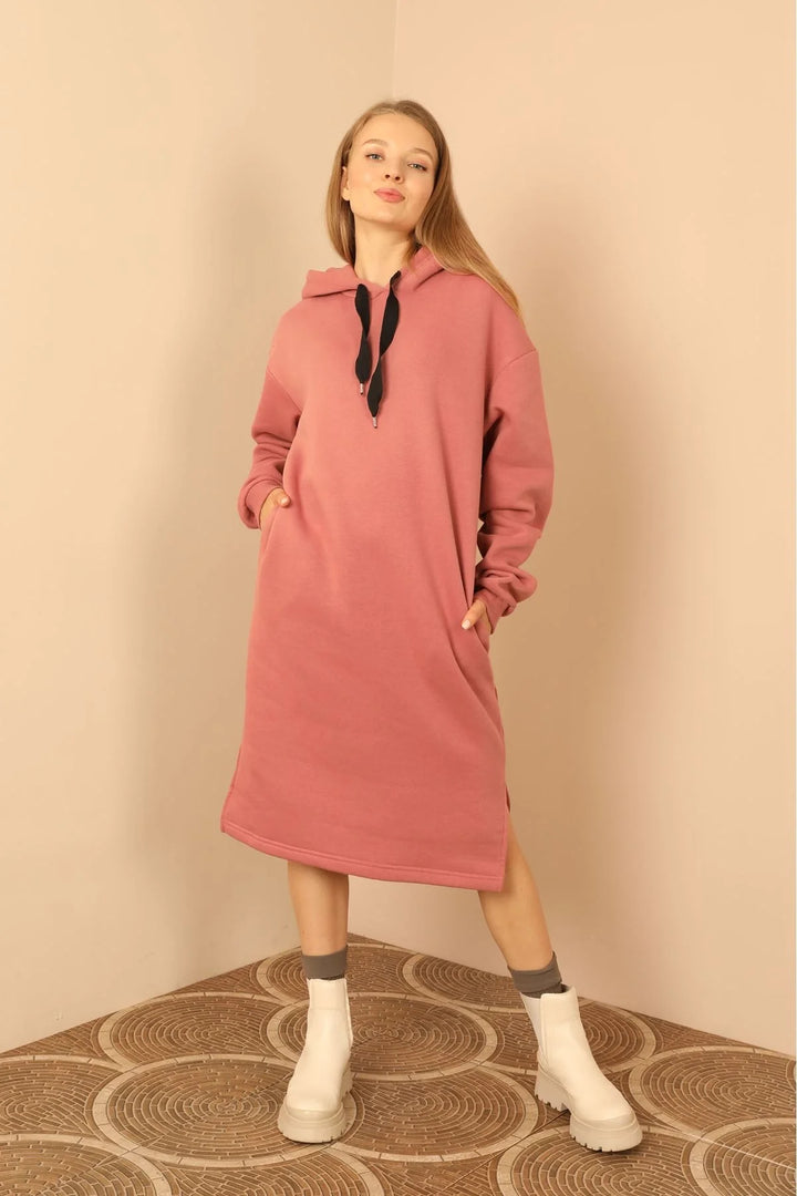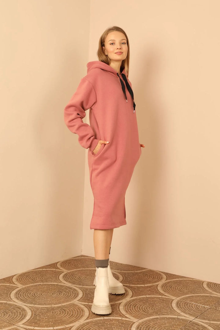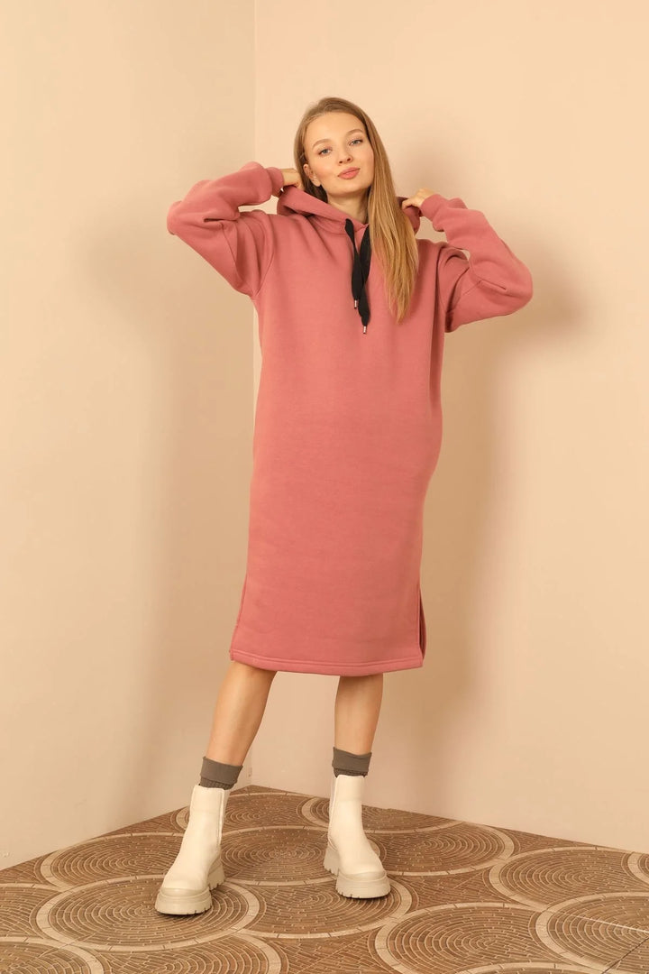 Şardonlu 3 İplik Kumaş Kapüşonlu Gül Kurusu Kadın Elbise, rahatlığı ve şıklığı bir araya getirir. Şardonlu 3 iplik kumaşın sıcak tutan yapısı, bu elbiseyi soğuk havalarda ideal bir tercih yapar. Kapüşonlu tasarımı, elbiseye sportif bir hava katarken, günlük kullanıma da uygundur. Toptan alımlarda, rahat ve kullanışlı ürünler arayan müşterileriniz için bu elbiseyi koleksiyonlarınıza dahil edin.
