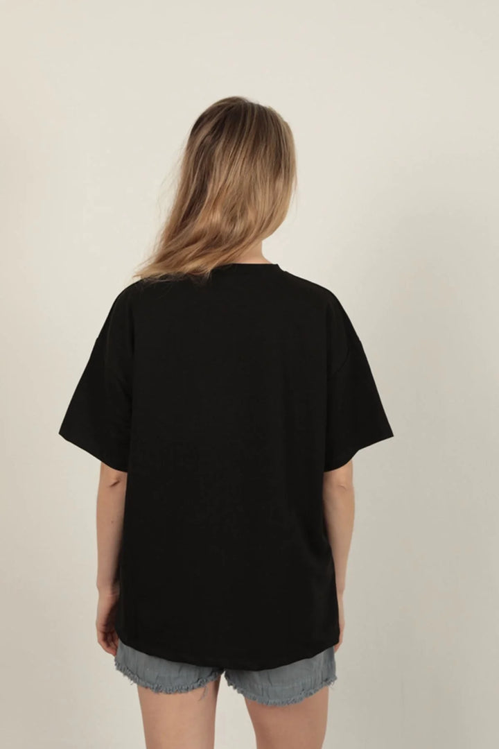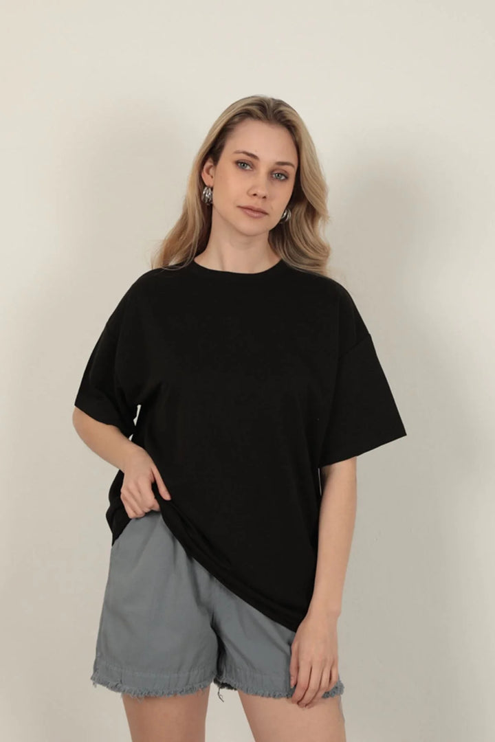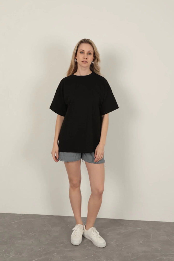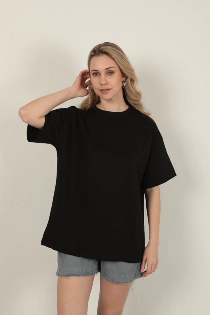 Sıfır Yaka Oversize İki İplik Tişört-Siyah