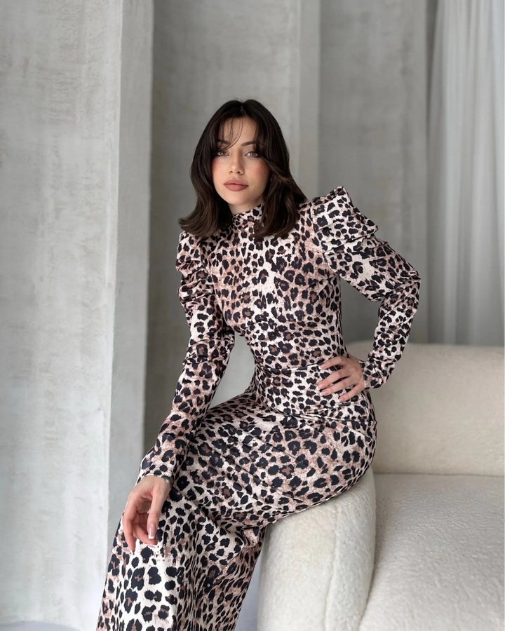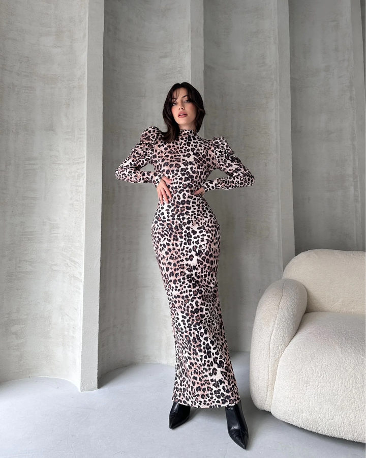 Sırt Dekolteli Leopar Desenli Elbise