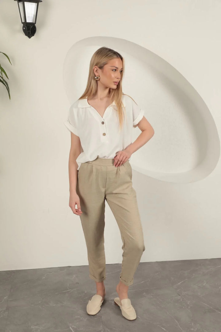 Sofia Keten Duble Paça Kadın Pantolon-Taş