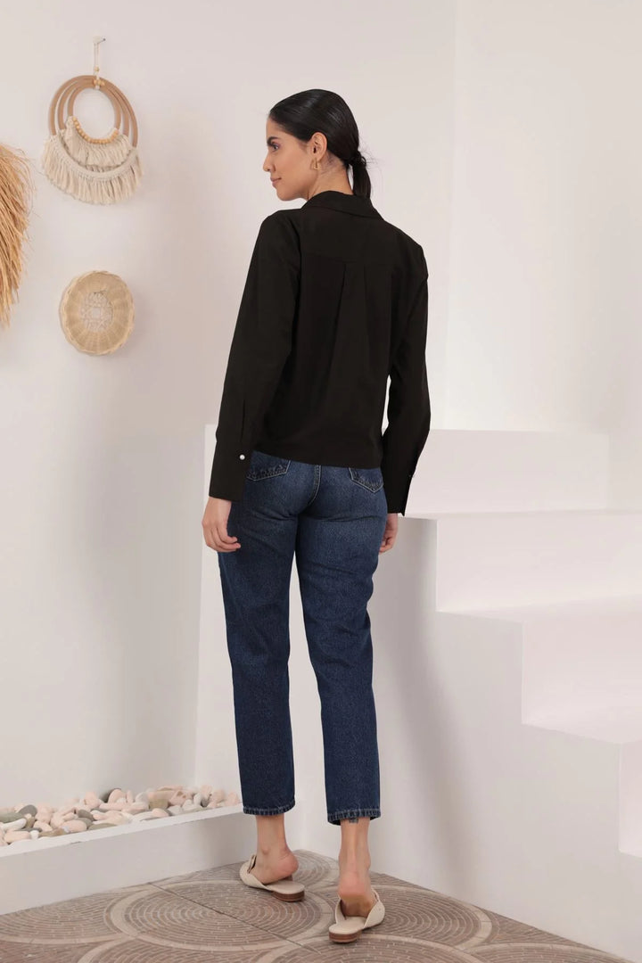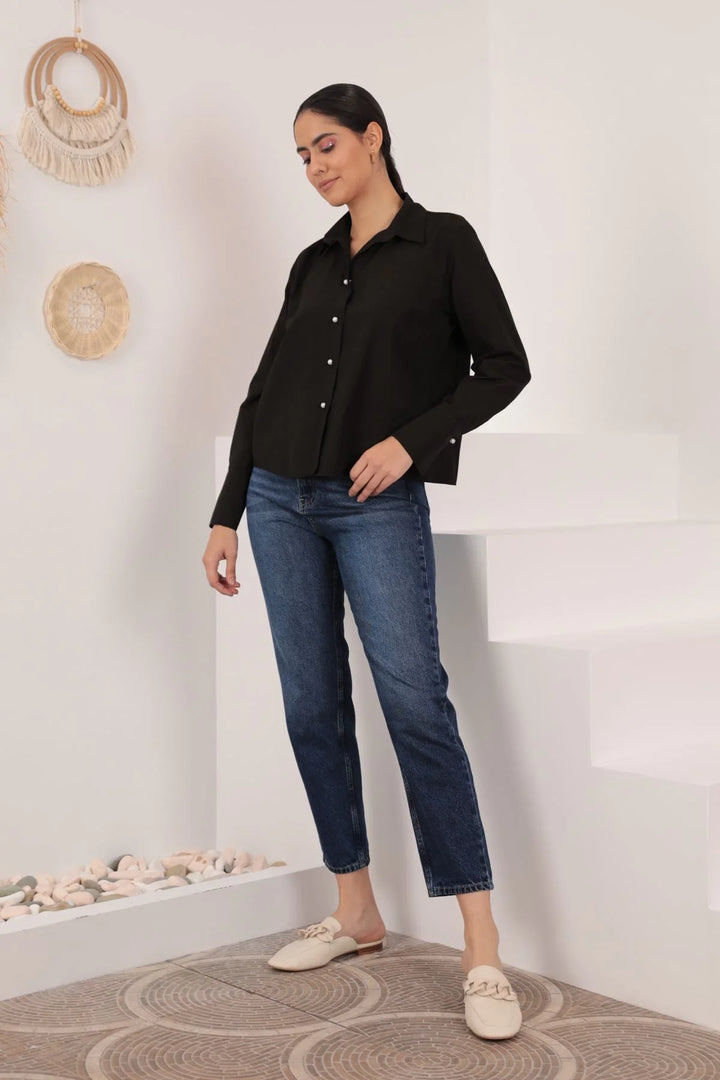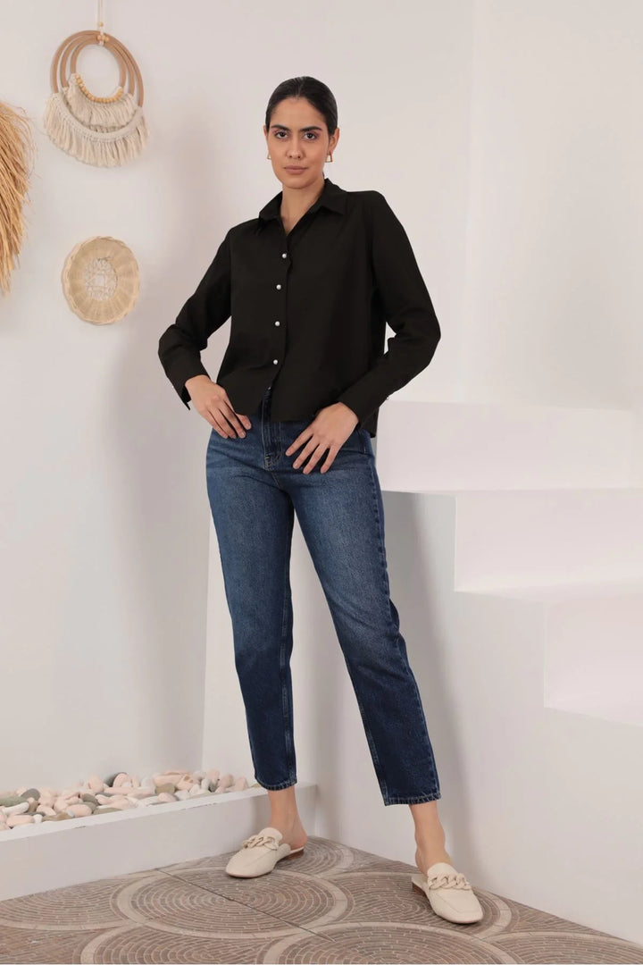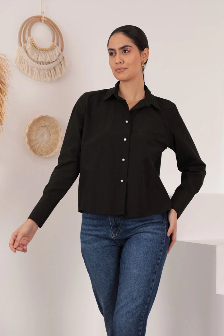 Soft Kumaş Crop Kadın İnci Düğme Detay Gömlek-Acı Kahve