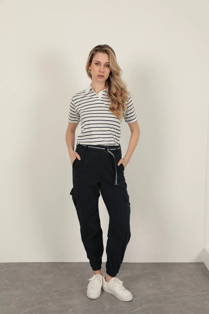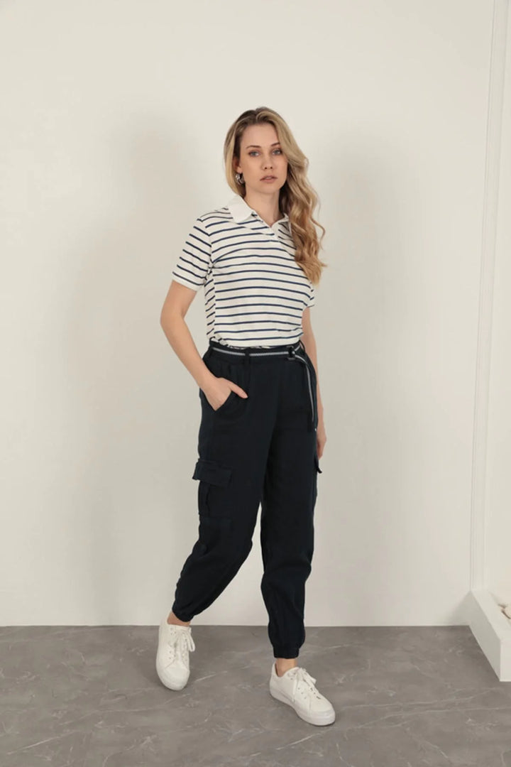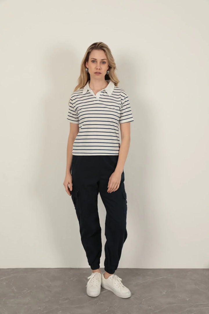 Süprem Kumaş Çizgili Kadın Tişört-Lacivert