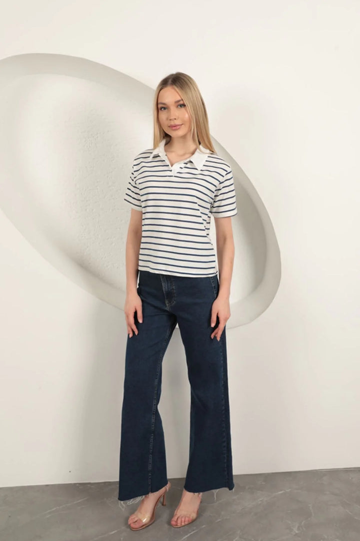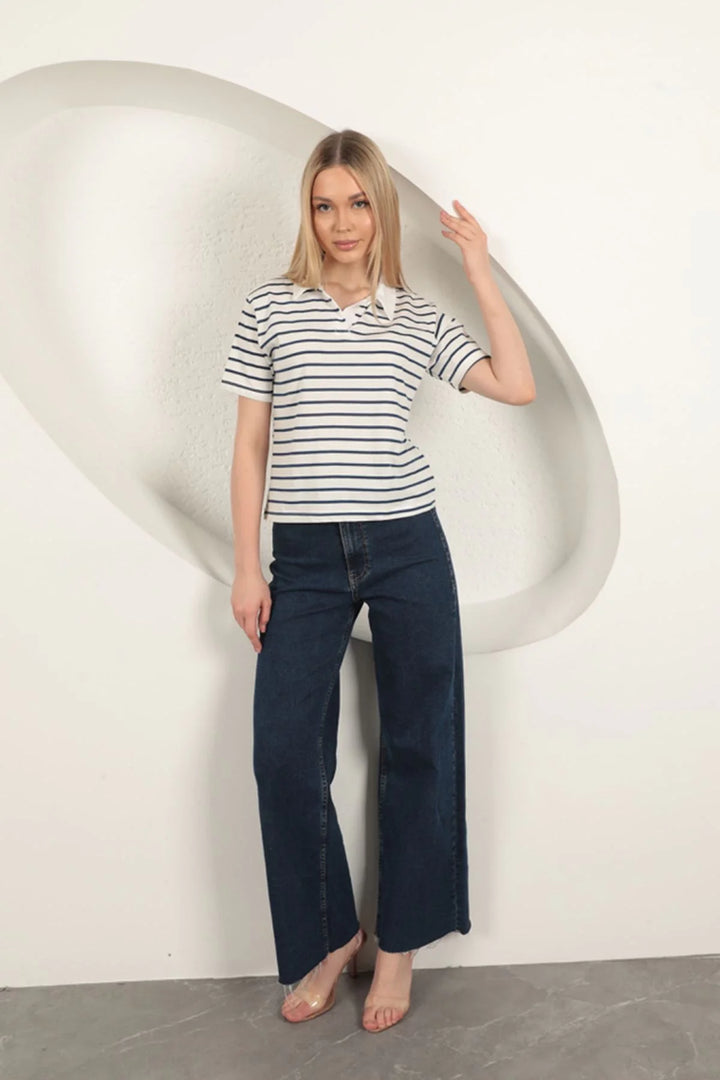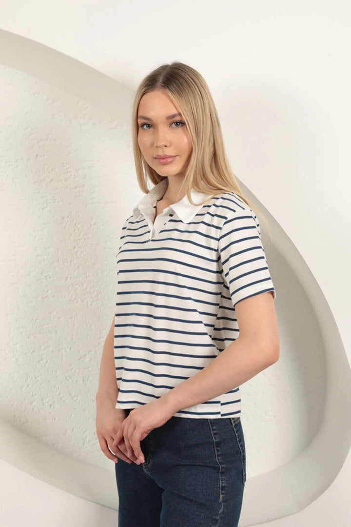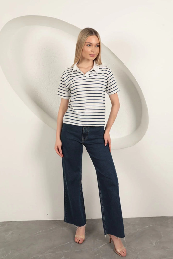 Süprem Kumaş Çizgili Kadın Tişört-Mavi