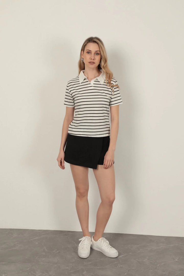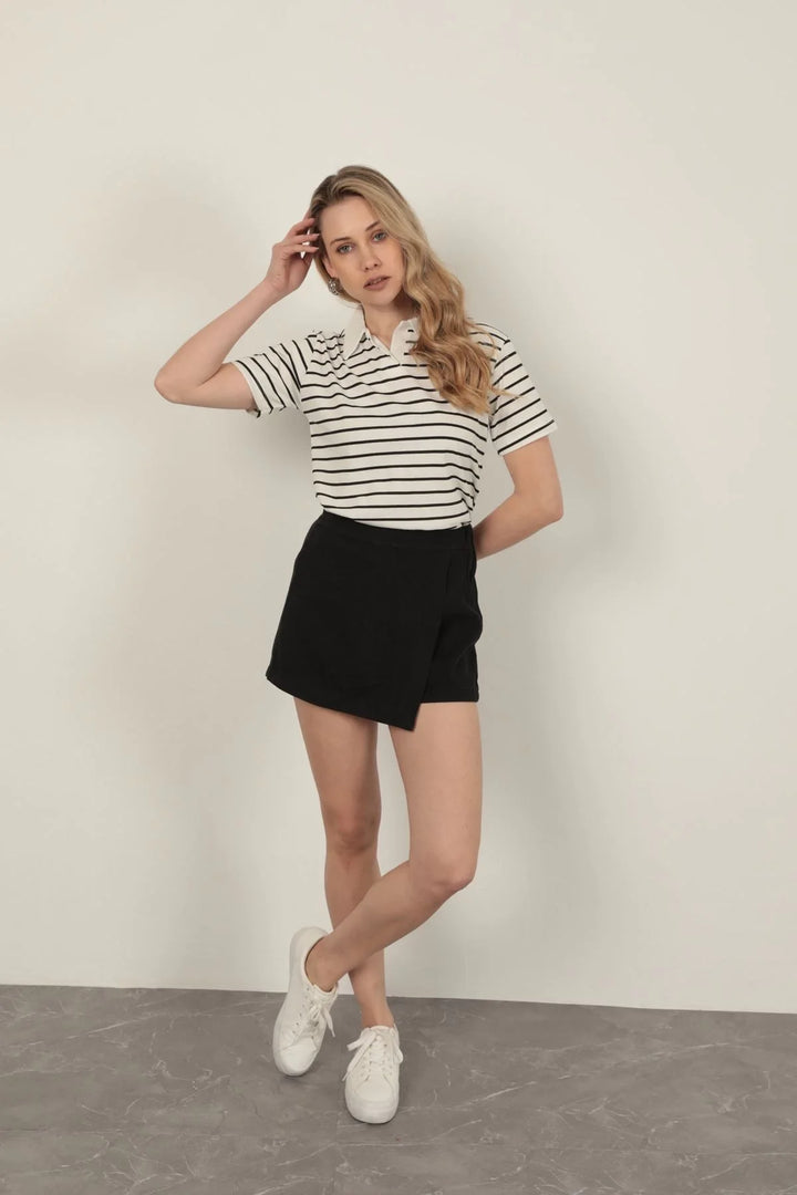 Süprem Kumaş Çizgili Kadın Tişört-Siyah