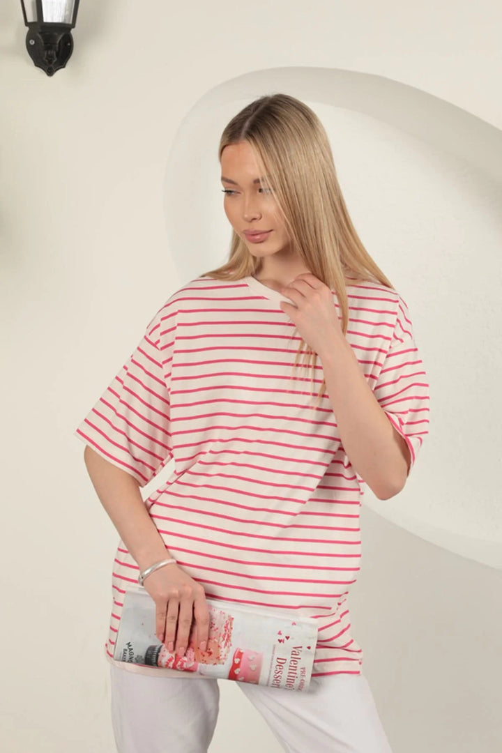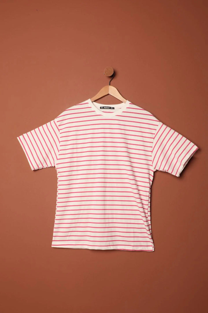 Süprem Kumaş Çizgili Sıfır Yaka Tişört-Fuşya