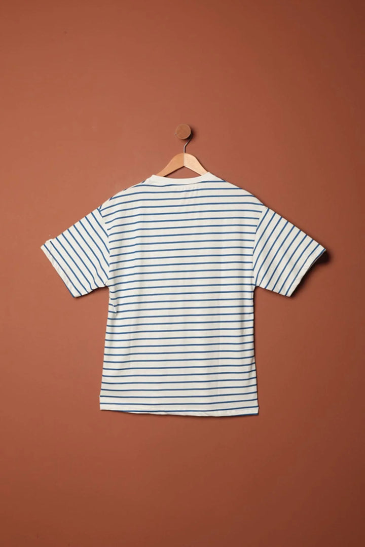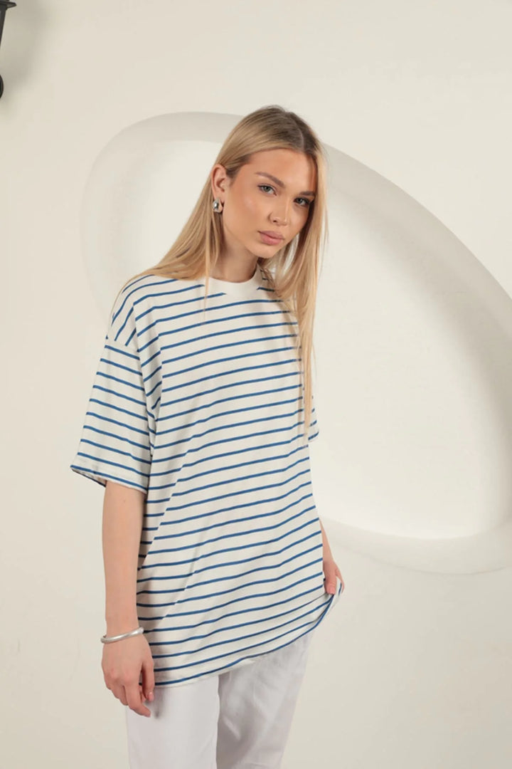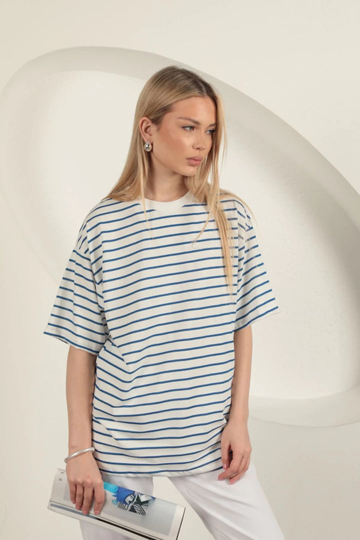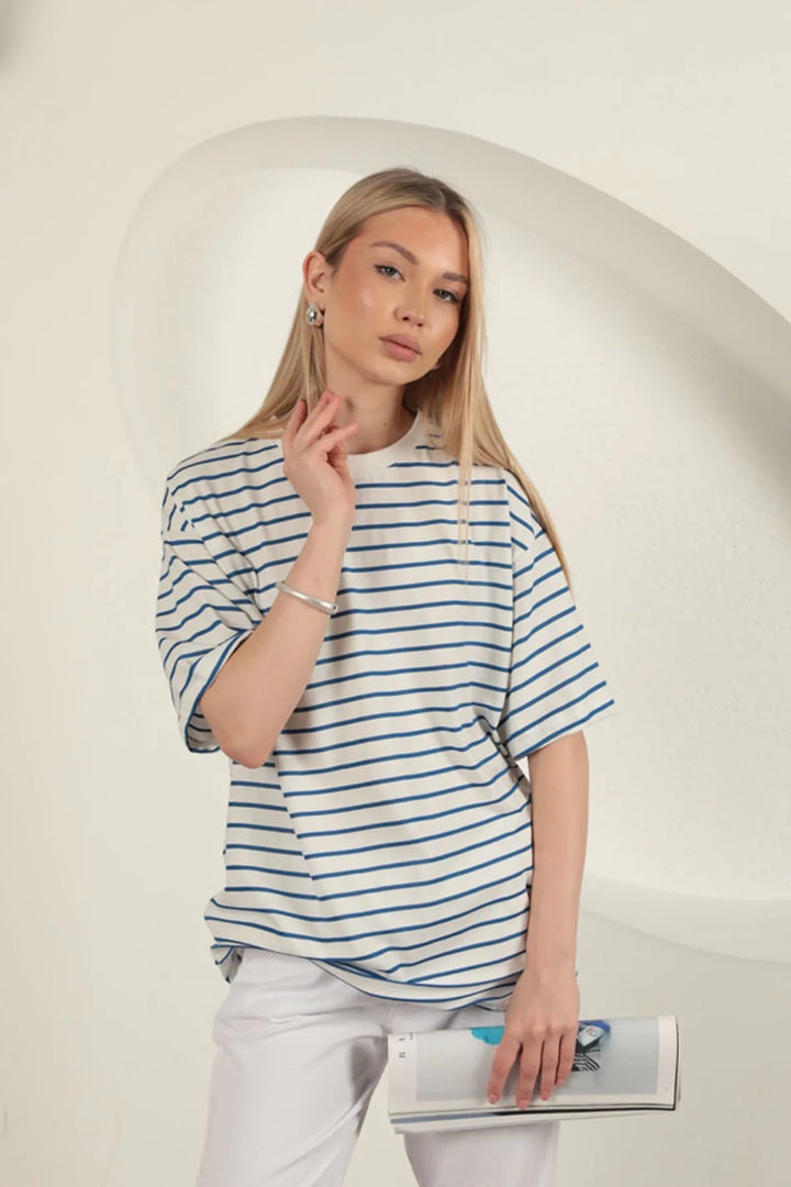 Süprem Kumaş Çizgili Sıfır Yaka Tişört-Mavi